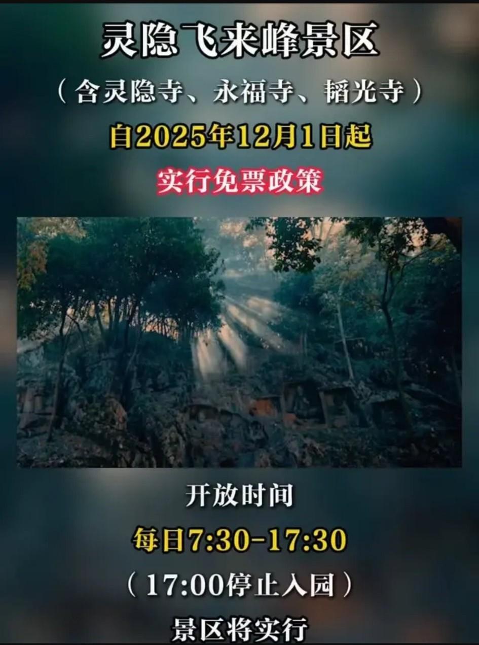 杭州灵隐寺门票说免就免(12月1日起), 表面看是亏了75块门票钱,实则是盘大棋! 为啥免费? 第一是文化账:飞来峰石窟是江南国宝级石刻,但总被当成灵隐寺“赠品”,免费开放才能真正让老百姓亲近历史,这波“还景于民”堪比20年前西湖免费! 第二是经济账:杭州早玩明白了——学西湖免费经验,门票亏小头,赚的是游客吃喝住购的大头!灵隐寺年客流过千万,多留一天就能拉动周边赚翻天。 第三是营销牌:2026年灵隐寺建寺1700周年,现在免费等于提前发“超级请柬”,把烧香打卡升级成深度文化游,打造杭州新IP! 但注意!免费≠随便进: 必须提前1天在支付宝/微信预约(当日无效!),工作日限流3.5万人。年卡用户年底前还能刷证直入。建议避开初一十五和节假日,否则挤到怀疑人生!灵隐寺 飞来峰