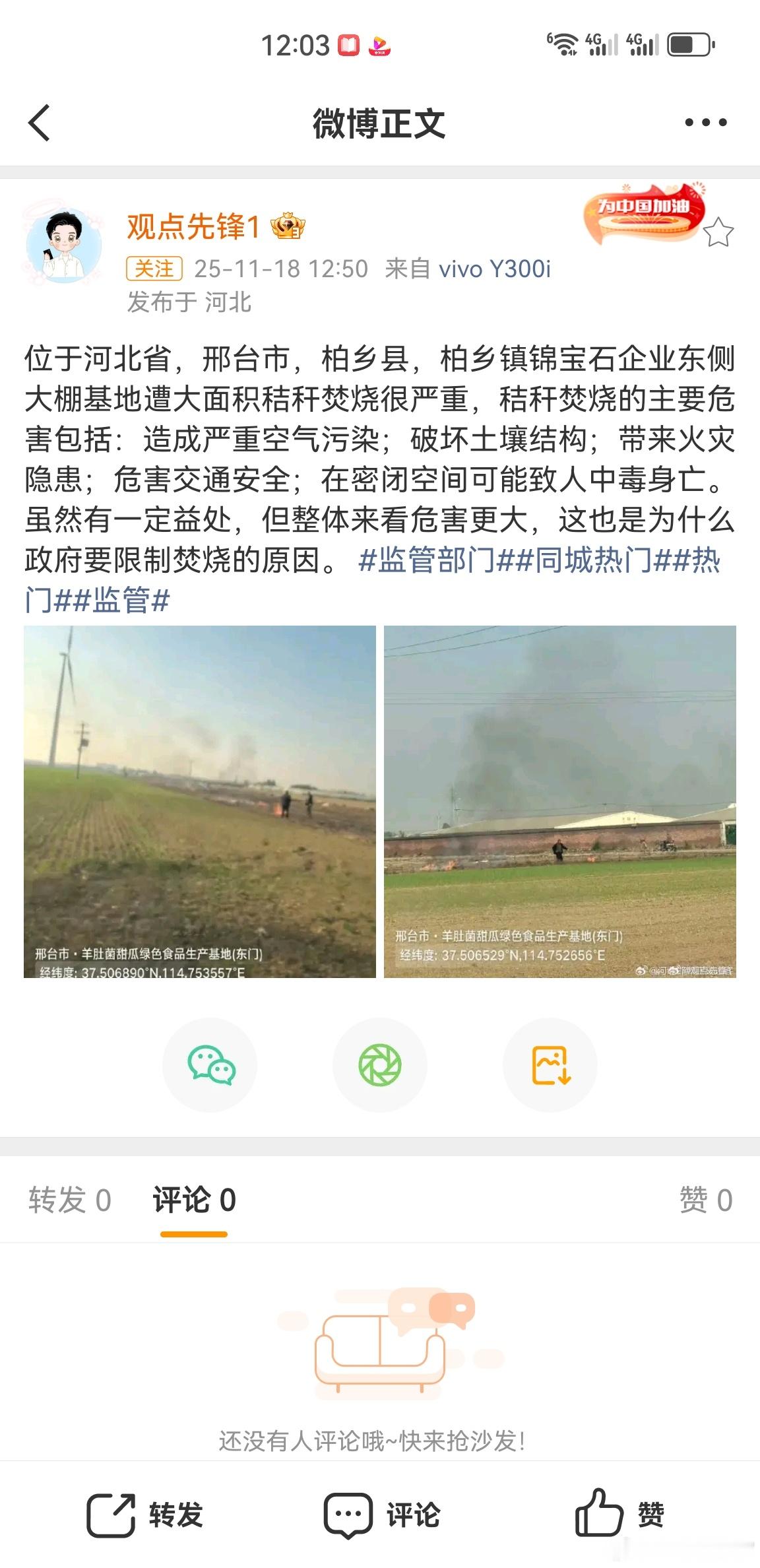 位于河北省,邢台市,柏乡县,柏乡镇锦宝石企业东侧大棚基地遭大面积秸秆焚烧很严重,秸秆焚烧的主要危害包括:造成严重空气污染;破坏土壤结构;带来火灾隐患;危害交通安全;在密闭空间可能致人中毒身亡。虽然有一定益处,但整体来看危害更大,这也是为什么政府要限制焚烧的原因。