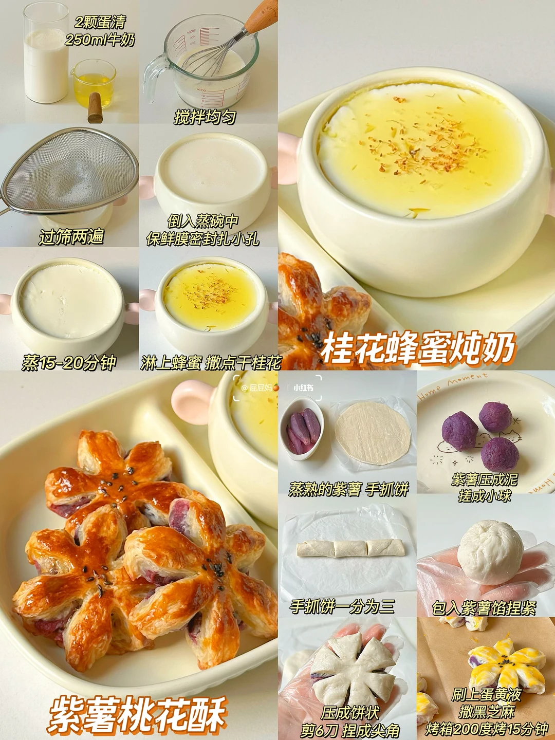 🌸紫薯桃花酥+桂花蜂蜜炖奶🍯