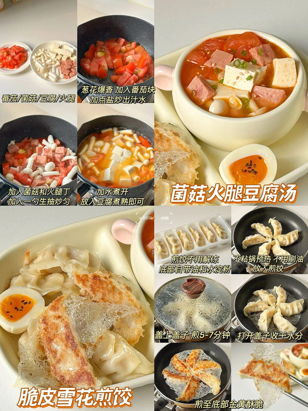 🥟脆皮雪花煎饺+菌菇火腿豆腐汤🍲