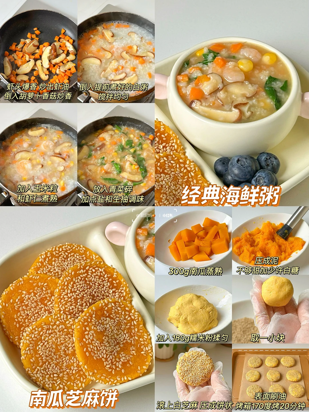 🎃南瓜芝麻饼+经典海鲜粥🥣