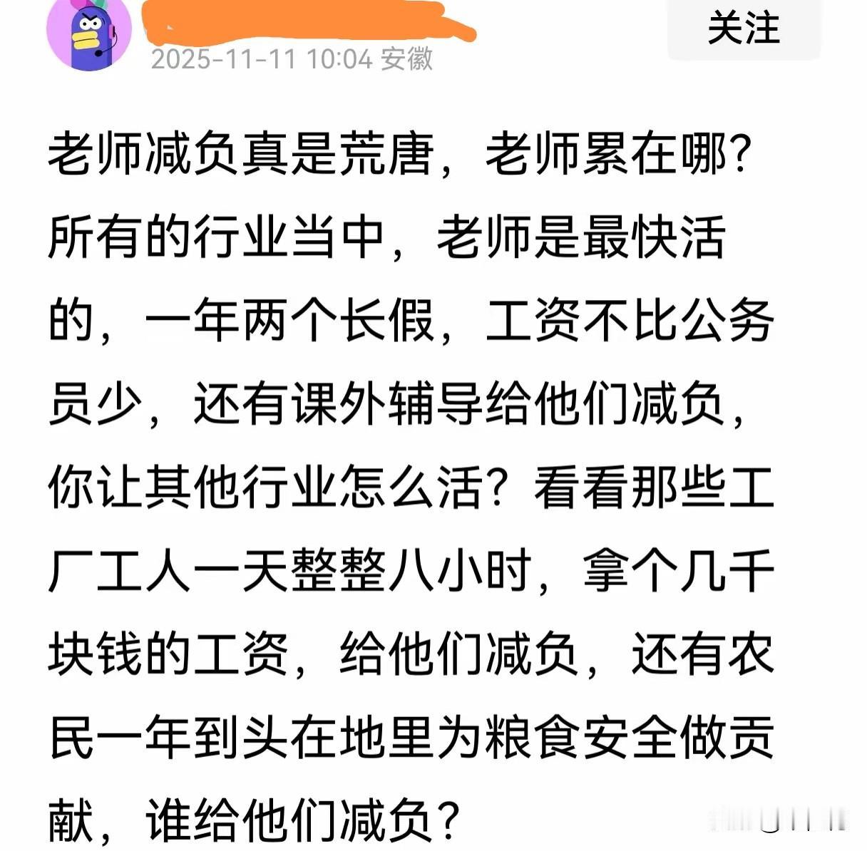 这个人真的恨老师!!! 他写这一段话的时候,不知道他的这些字是谁教的?难道是自学的? 我们高中老师轻松吗?看一看我给你细细长长的说来: 班主任:早上6:20准时到校蹲班看学生早读,之后是课间跟着学生早操,课余负责楼道纪律;备课上课一样也不落下,下午2:10到校进班看学生,下午5:30放学,6:30所有班主任进班看学生晚读,有晚自习和晚读的班主任下午回不了家,直接在学校餐厅吃一点。如果晚上安排值周,班主任必须在下了晚自习在学校附近公路沿线值守,负责学生安全;如果有公寓检查,班主任必须要检查公寓。 60几个班级,所有班主任不是铁打的,也有家庭,有爱人有孩子,连轴转,周六是必须补课的,毕竟是高中,以高考为导向。班主任家的孩子班主任根本没有时间去辅导。 班主任几乎是拿命去奋斗,高考结束,总有那么几个人班主任会被累爬了。 普通教师:早上7:10到校,如果有早读的,必须6:30到校负责早读,除过上课还有集体备课,各种教研活动,周末经常参加教研教改听课活动,因为这些活动与课改和高考相关,必须参加。 高三晚自习延长到10:30,越到临近高考,周末全天补课。 一般高中学校,都在4—7月份承担中高考和大型结束考场建设,所有的教师和处室人员,连轴转,最是高考考场布置的前一周时间,所有的后勤人员几天几夜回不了家,一个考场一个考场的检查,确保考场布置全面。第二学期所有的考试结束,后勤人员和处室人员几乎累虚脱了。 在这里,我认为教师的寒暑假是拿其余的时间置换而来的。 大多数单位的人有时间早晚能够接送孩子上下学,高中教师根本没有时间,真正的起的早睡得迟。