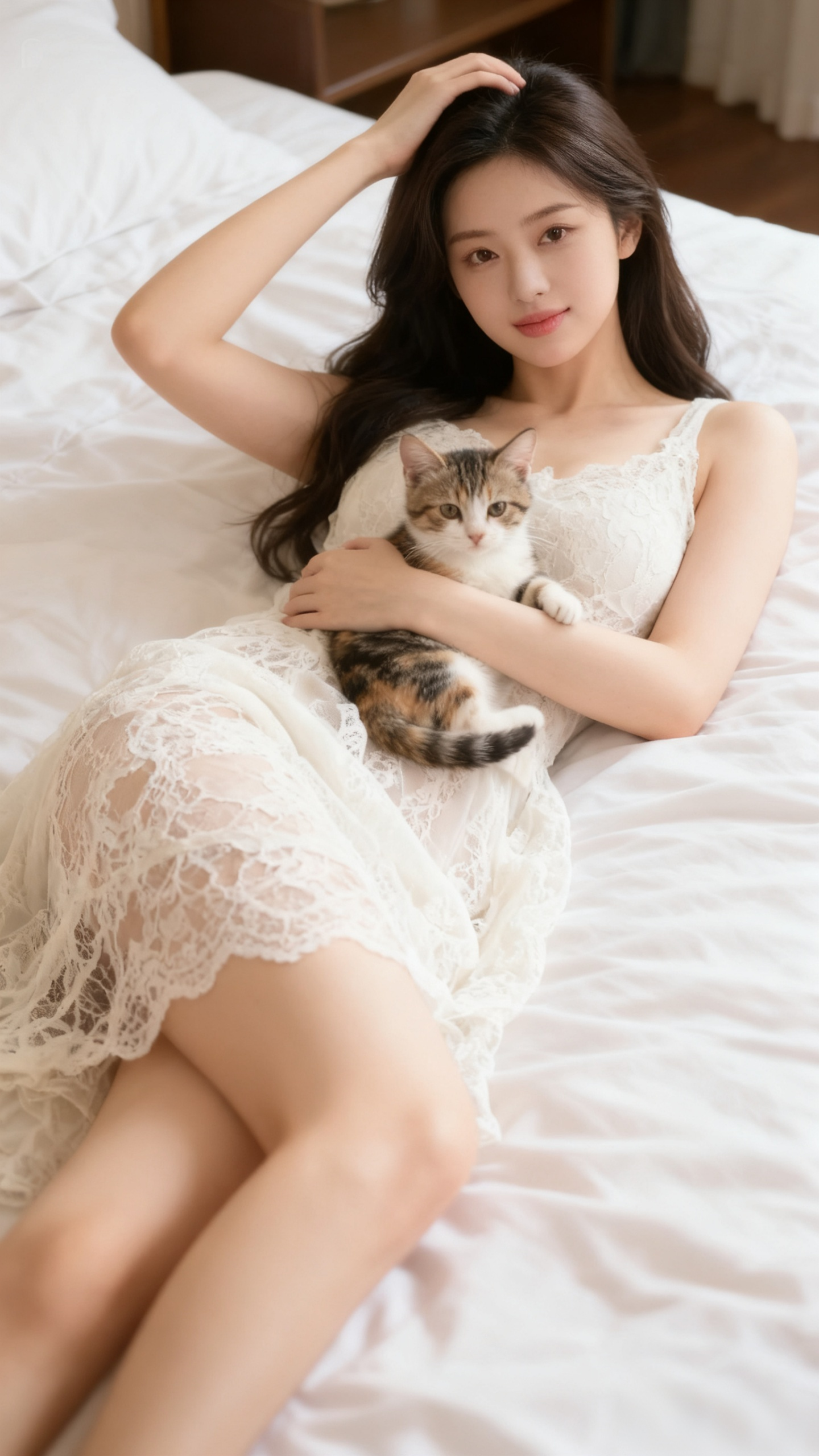 冷艳黑发女孩,温柔抱猫,静谧夜晚。