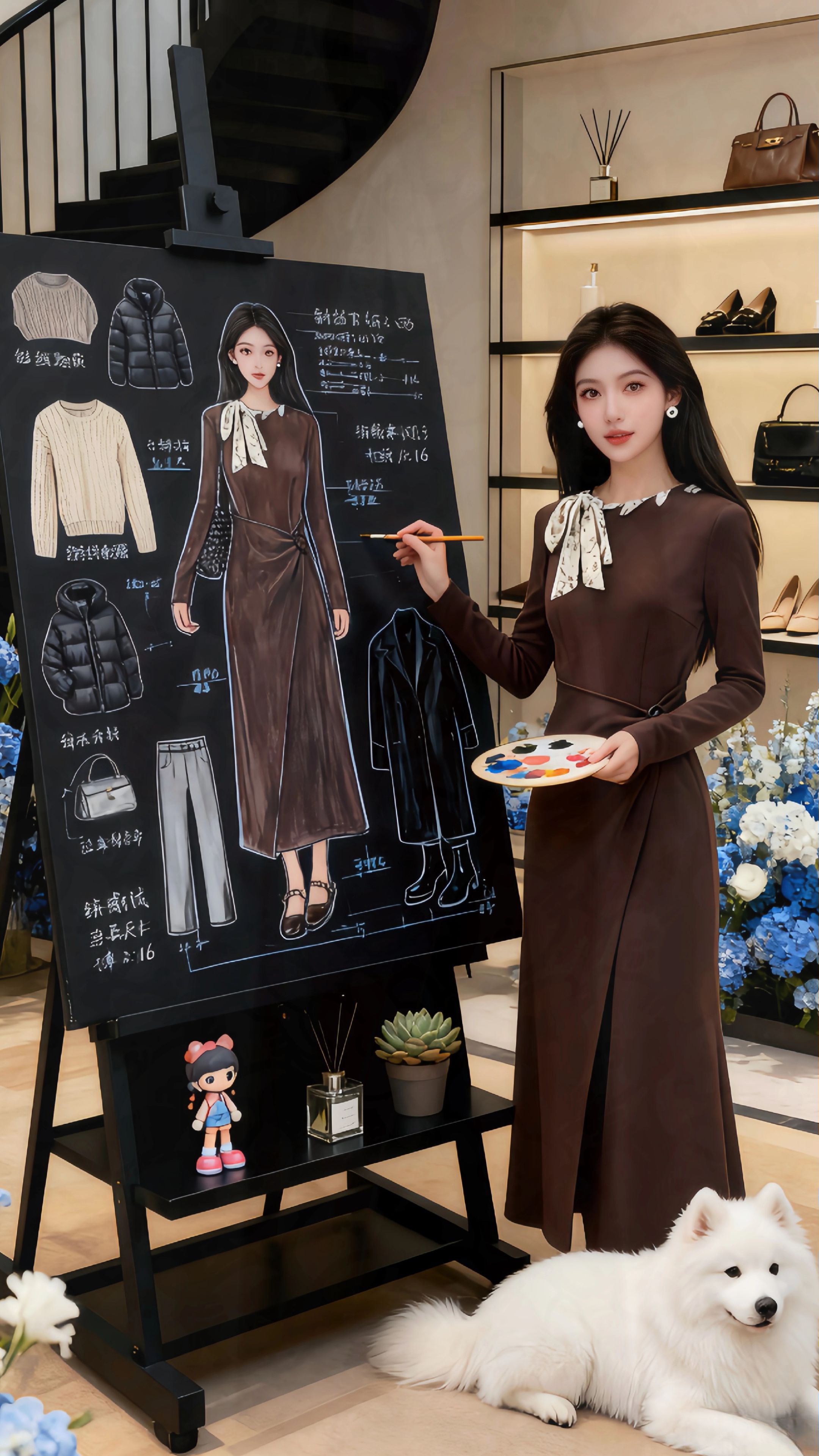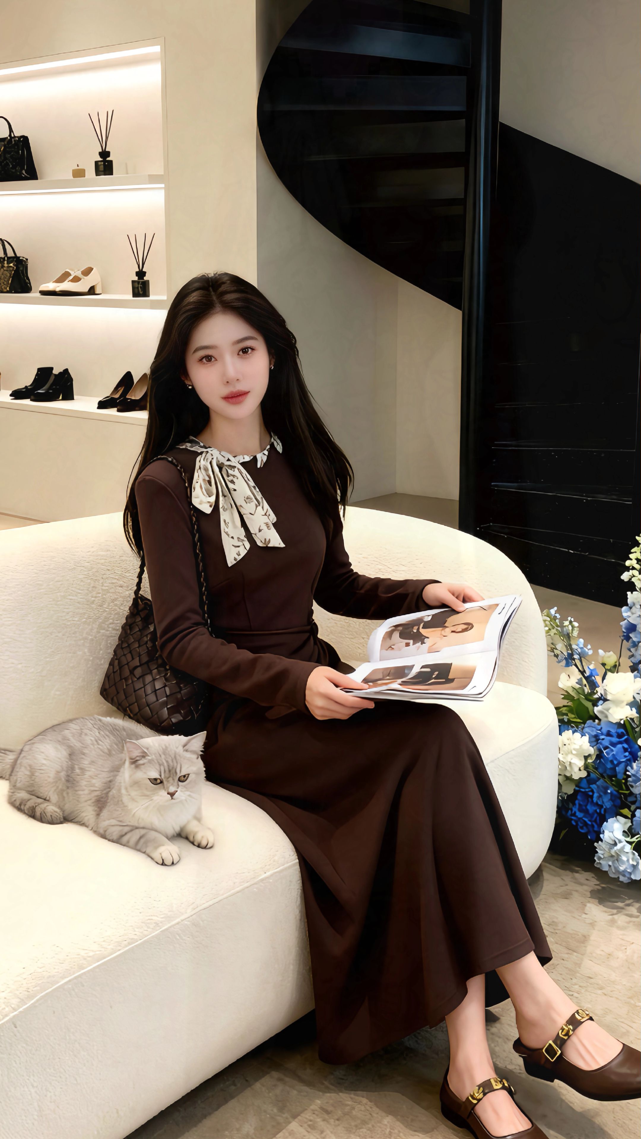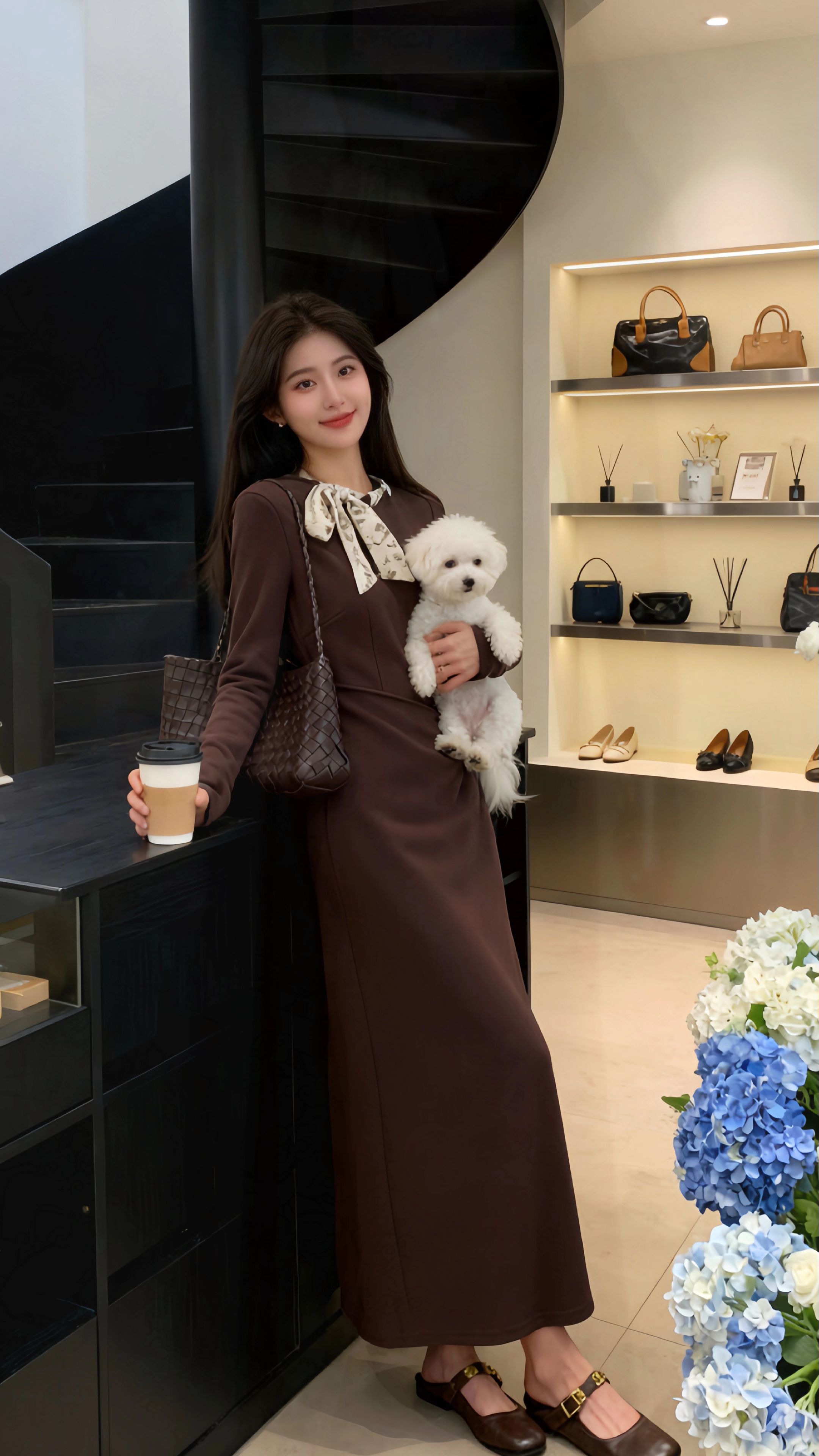 谁懂啊!这裙子把“显瘦+气质”玩明白了~圆领+领口绑带,简约又有小心机;长袖适配秋凉,修身剪裁紧衬身材曲线,侧边扭结+开衩设计,走路带风还巨藏肉,深棕色系显贵又衬肤色,搭复古小皮鞋+菱格包,往同款人体模特旁一站,背景黑螺旋楼梯、蓝白花卉一衬,高级感直接拉满!
