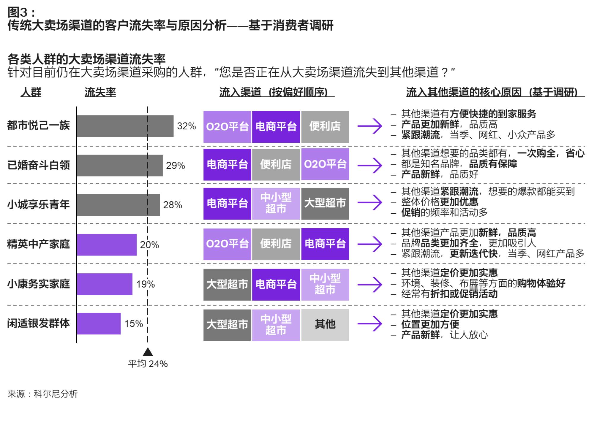 【商超零售的核心人群正在远离大卖场】通过消费者调研,科尔尼发现:商超零售的核心人群正在远离大卖场,来客数和客单价都出现了下滑,疫情期间更是如此。更可怕的是,这一“离场”趋势不仅包括新世代的年轻群体,还包括务实家庭等传统的大卖场主力客群。究其原因,大卖场与消费者“离心”的根本在于传统的卖场模式已经难以满足日新月异的消费者需求。面对以新零售为代表的众多替代渠道,大卖场从选品、陈列、环境、服务等多个方面都相对缺乏新意,难以给消费者提供充足的到店理由。
