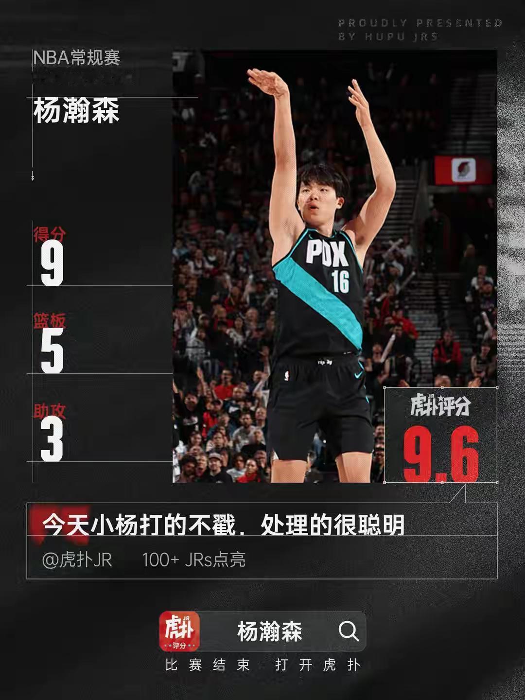 关注杨瀚森,关注杨瀚森在NBA的比赛。杨瀚森练级归来,间隔8场NBA常规赛后,杨翰森今天上场对战太阳队。 次节8分23秒时,杨翰森上场!杨瀚森背身单打,造对方犯规,回来又是一个双手暴扣。杨翰森得4分1篮板1助攻,投篮3中2,得分、助攻数据拉满。 全场比赛杨瀚森登场13分钟,得9分5篮板3助攻。 恭喜杨翰森,重新进入开拓者轮换。杨瀚林NBA 新星杨瀚森