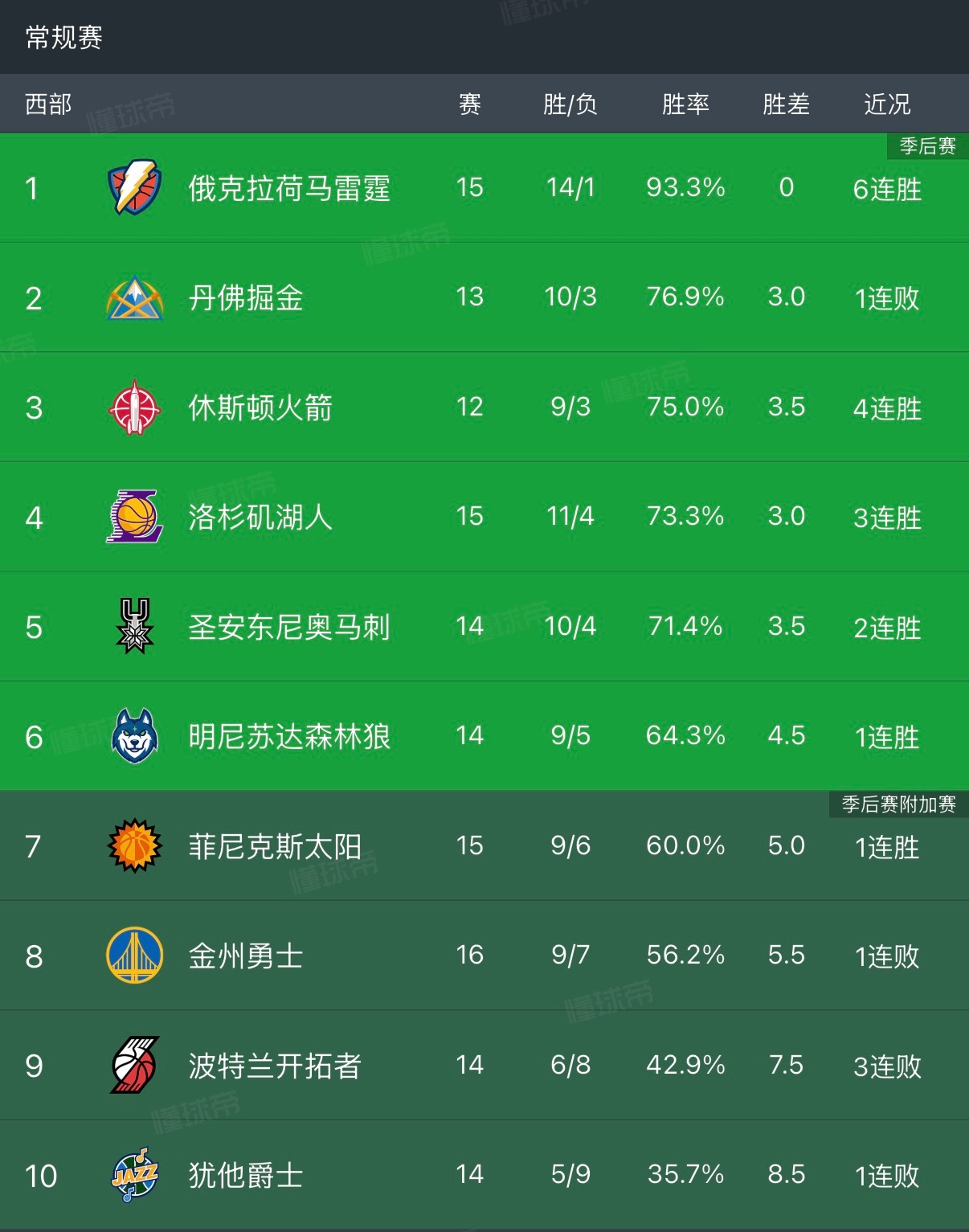 今日赛后湖人继续排在西部第四,竞争非常激烈。湖人要尽量保持在西部前五这个梯队,这
