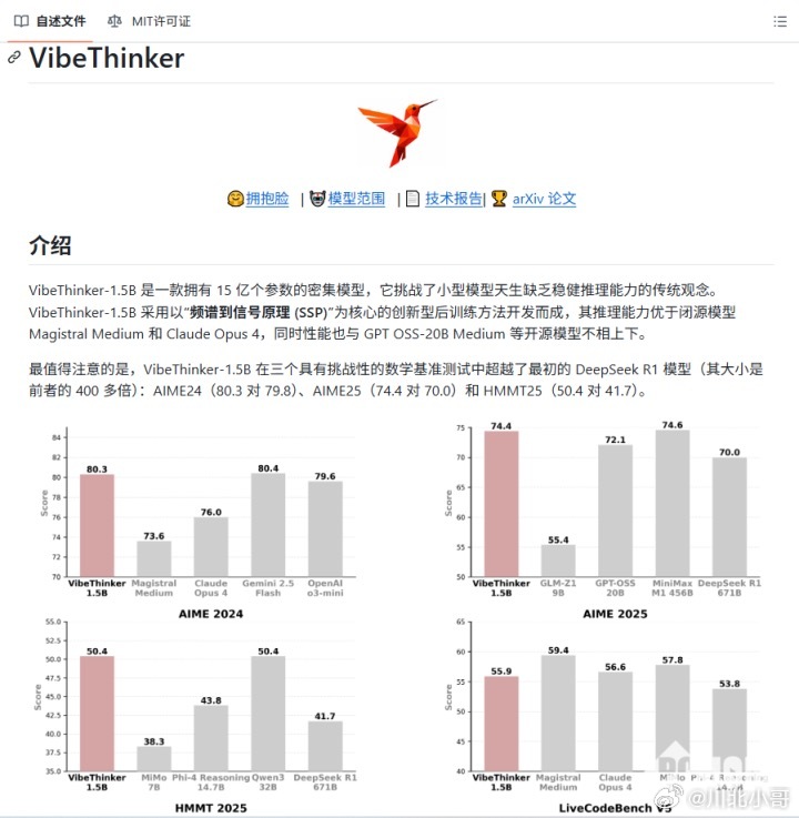 微博发布的开源的VibeThinker-1.5B,用15亿参数在数学竞赛基准中击败6710亿参数的DeepSeek R1,7800美元训练成本较同类大模型降低数十倍,彻底打破“参数即王道”的行业认知。其核心技术优势源于创新的SSP训练原则:SFT阶段聚焦“频谱多样性”,以Pass@ K 指标鼓励多思路解题,再通过模型合并融合各领域专家能力;RL阶段则精准“收敛信号”,借助MGPO框架聚焦“学习甜点区”优化,让小模型兼具思维广度与精度。相较于大模型,VibeThinker的优势堪称精准打击:成本上无需天价算力,中小企业皆可负担;部署上适配终端设备,本地运行兼顾隐私与速度;效率上垂直领域推理更高效,避免大模型的冗余消耗。但小模型也存在知识覆盖较窄、跨领域泛化不足的短板,而大模型虽在全局认知上占优,却受限于高成本、高延迟的落地困境。在大模型占据舆论高地的当下,小模型正凭借独特优势强势突围,成为AI行业的新风口。其“香”味核心源于三大硬实力:部署成本极低,无需昂贵GPU,可直接嵌入手机、机器人等终端,完美解决大模型“落地难”的痛点;数据隐私更有保障,本地运行无需依赖云端,规避了数据传输中的泄露风险;反应速度更快,在文档总结、内部检索等特定任务中效率远超大模型。相较于大模型,小模型虽参数有限、知识覆盖较窄,但在垂直领域更“术业有专攻”,能精准匹配中小企业或特定场景需求,而大模型则面临算力消耗巨大、泛化能力不足、存在知识与逻辑污染等问题。未来AI绝非两极分化,而是“大模型统筹+小模型落地”的协同生态。VibeThinker这类小模型,正以技术创新推动行业从“规模竞赛”转向“效率革命”,成为终端智能、垂直场景的核心载体,与大模型共同构建更具普惠性的AI产业新生态。
