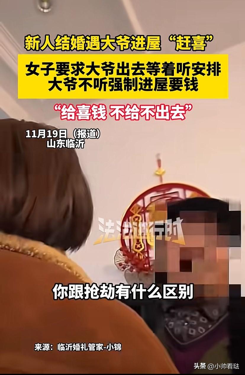 这和抢劫有什么区别?山东临沂一对新人结婚,不料一位大爷突然闯入新房“赶喜”。他声称自己放了鞭炮,要求新人给喜钱,一行6人每人都要,总共索要100元。婚礼现场的女子礼貌请大爷先出去等待,可大爷表示“不给喜钱就不走!” 一对新人结婚本来挺好的一件事,一位大爷突然闯进婚房,索要“喜钱”,不给钱就不走。 原来,大爷一行6个人在外面放了鞭炮,要求每人给点“百年好合”的祝福钱就离开,总共索要100元,还称这个数目并不多。 面对这突发状况,一名在现场管理的女子站出来表示,你先出去待会有人安排,不要进婚房。 可大爷就是不听劝告,态度强硬地表示:“不听你安排,你不当家,我就不出去。”他坚持要留在屋内,并继续索要喜钱。 女子当场就急眼了:“不听安排,一分钱没有!你这和抢劫有什么区别?” 有网友吐槽:“这就是明抢,喜庆的传统为什么能走到如今这种无耻的地步” 这大爷的行为太过分了!结婚是新人的喜事,强行闯屋要钱根本不是“赶喜”,是借着习俗耍无赖,既破坏了婚礼氛围,更是没边界、没规矩的冒犯,这种倚老卖老的行为,真该好好管管了! 根据《治安管理处罚法》第二十六条:追逐、拦截他人的;强拿硬要或者任意损毁、占用公私财物的,按寻衅滋事处理,处5日以上10日以下的拘留。 俗话说“别搬起石头砸了自己的脚”,不要以为别人大喜之日不跟你计较,别人真要追究起来,大爷肯定吃不了兜着走! 对此,你们怎么看呢? 新人结婚遇大爷进屋“赶喜”