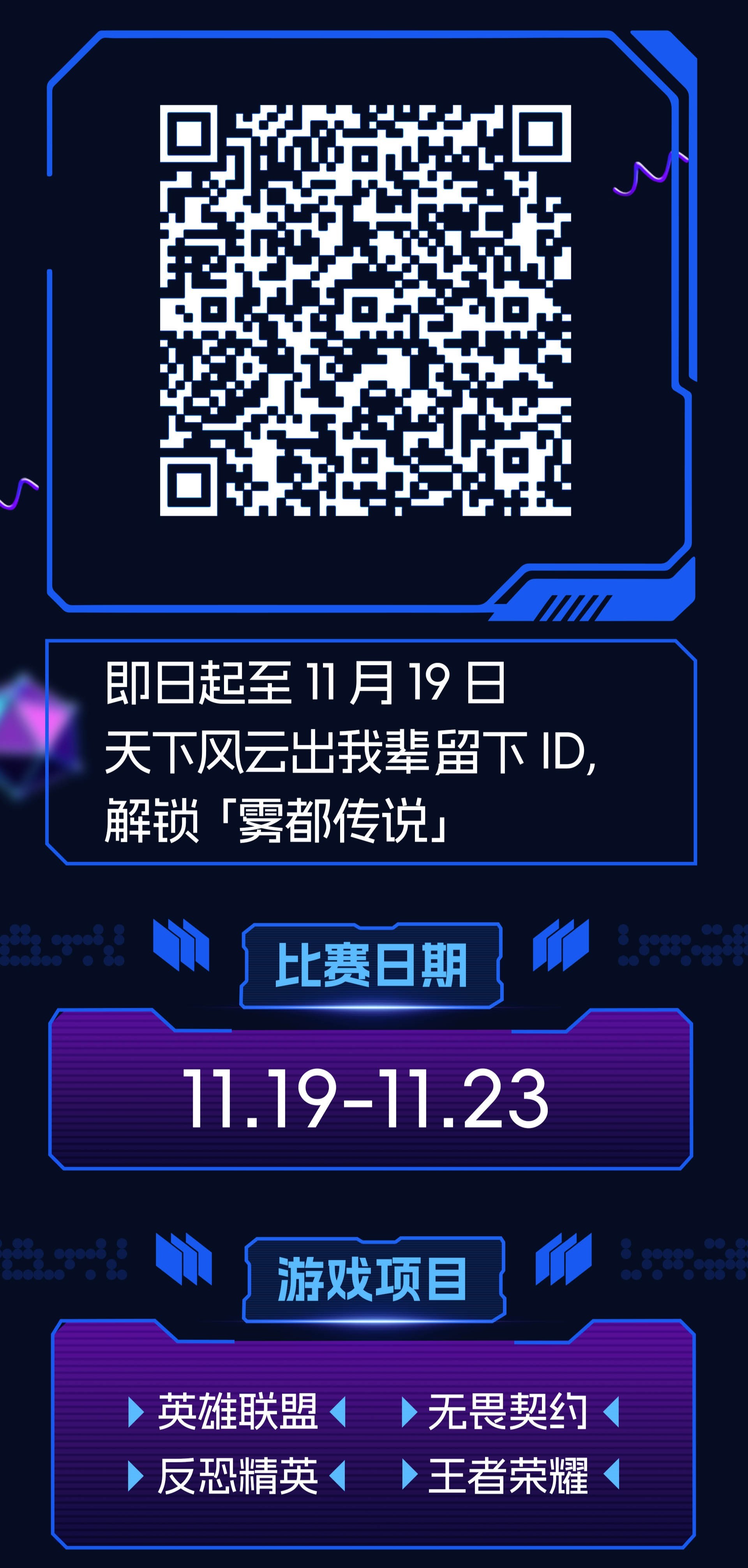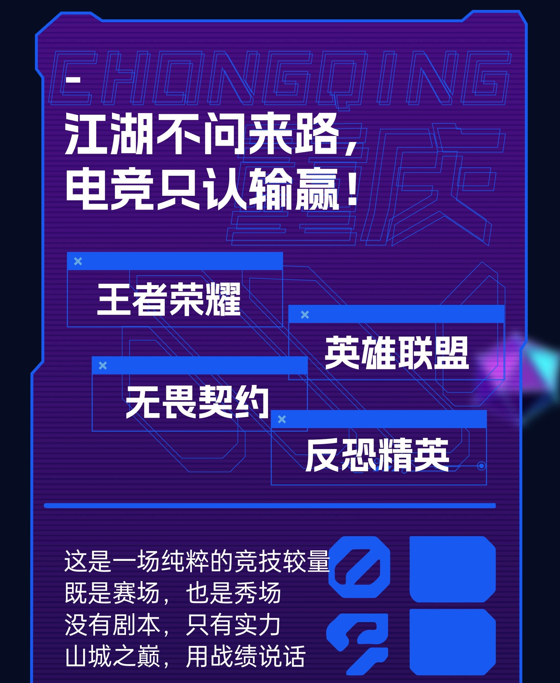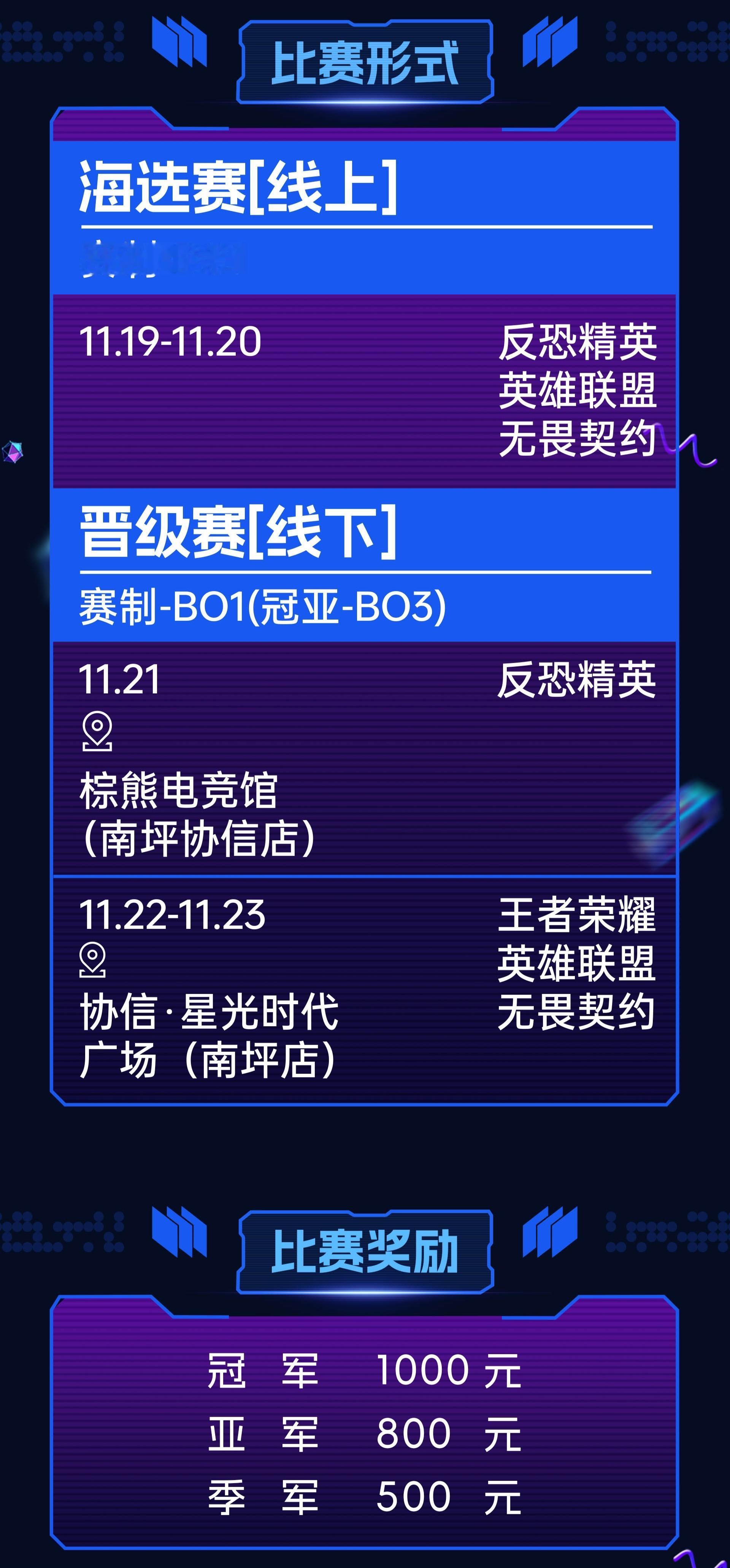 🔥重庆电竞热血开战!四款游戏+千元奖金等你来战!🔥斗魂涌动 竞在雾都 重庆站 线上线下全面启动!🎮✨重庆的电竞er们集合啦!👉 比赛游戏:王者荣耀、英雄联盟、无畏契约、反恐精英👉 报名时间:即日起-11月20日👉 赛程亮点:✅ 线上海选(11.19-11.20):19日:反恐精英 BO120日:英雄联盟+无畏契约 BO1✅ 线下晋级(11.21-11.23):21日:反恐精英 BO1/冠亚BO3(📍棕熊点精光·南坪协信店)22-23日:王者荣耀+英雄联盟+无畏契约(📍协信星光时代广场南坪店)👉 转发本条,,一起冲击冠军!🏅・扫描图4️⃣二维码 成为峡谷与枪战中最靓的崽・扫描图6️⃣二维码 一起预测赛事黑马吧PEGT将携手 一起聆听赛场声音