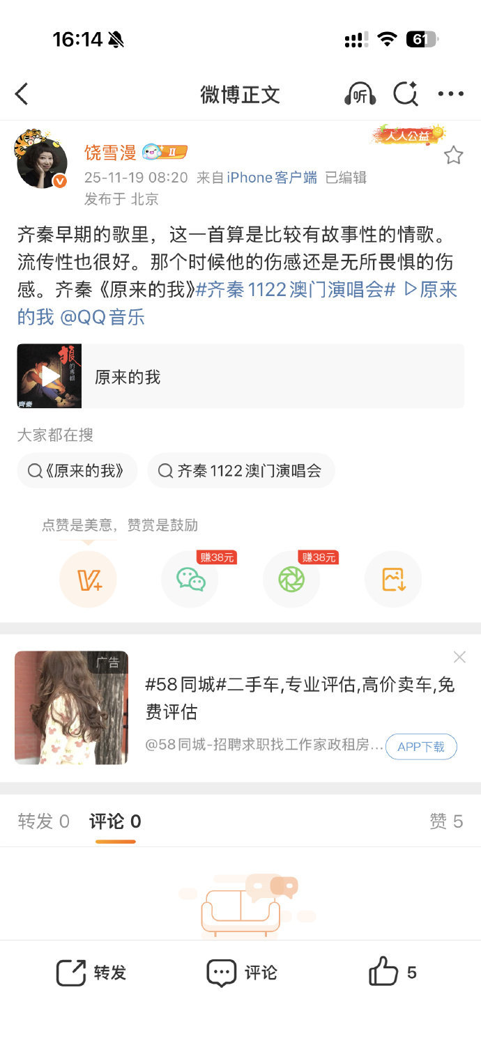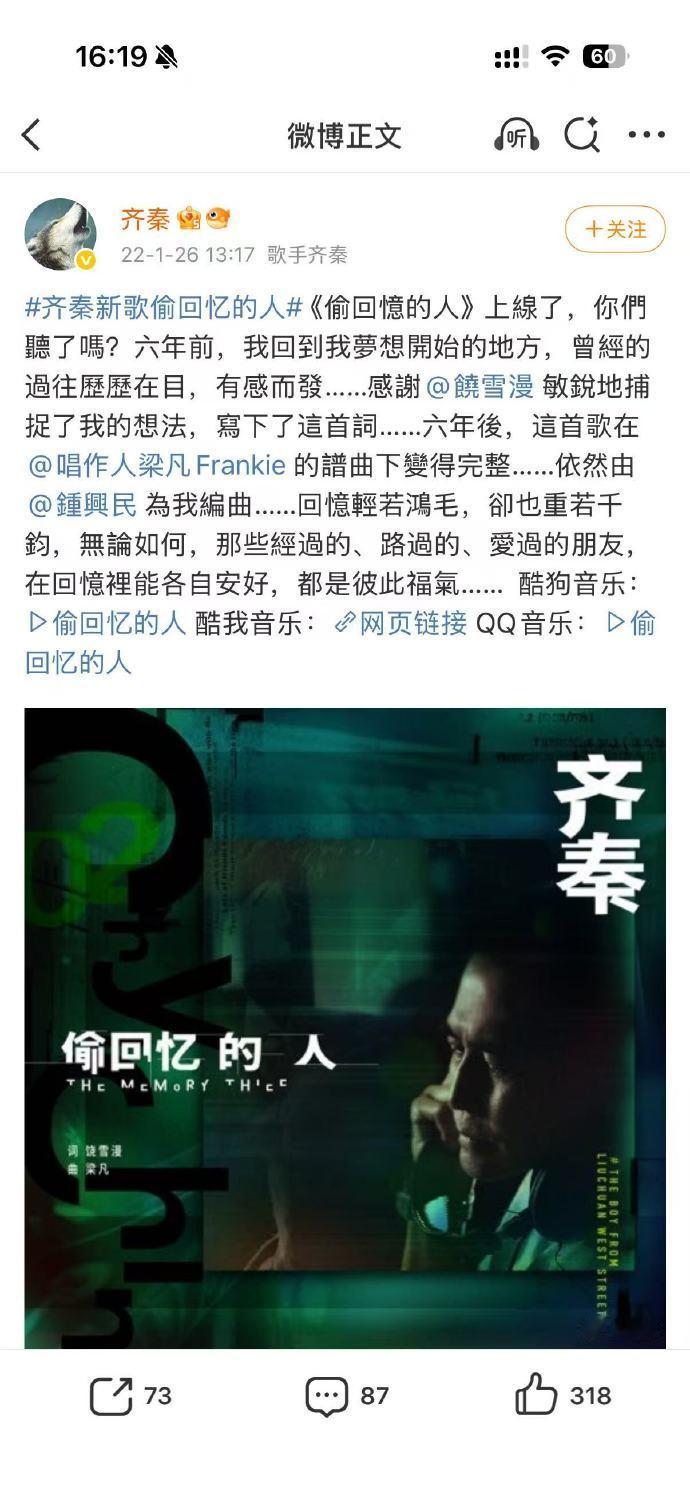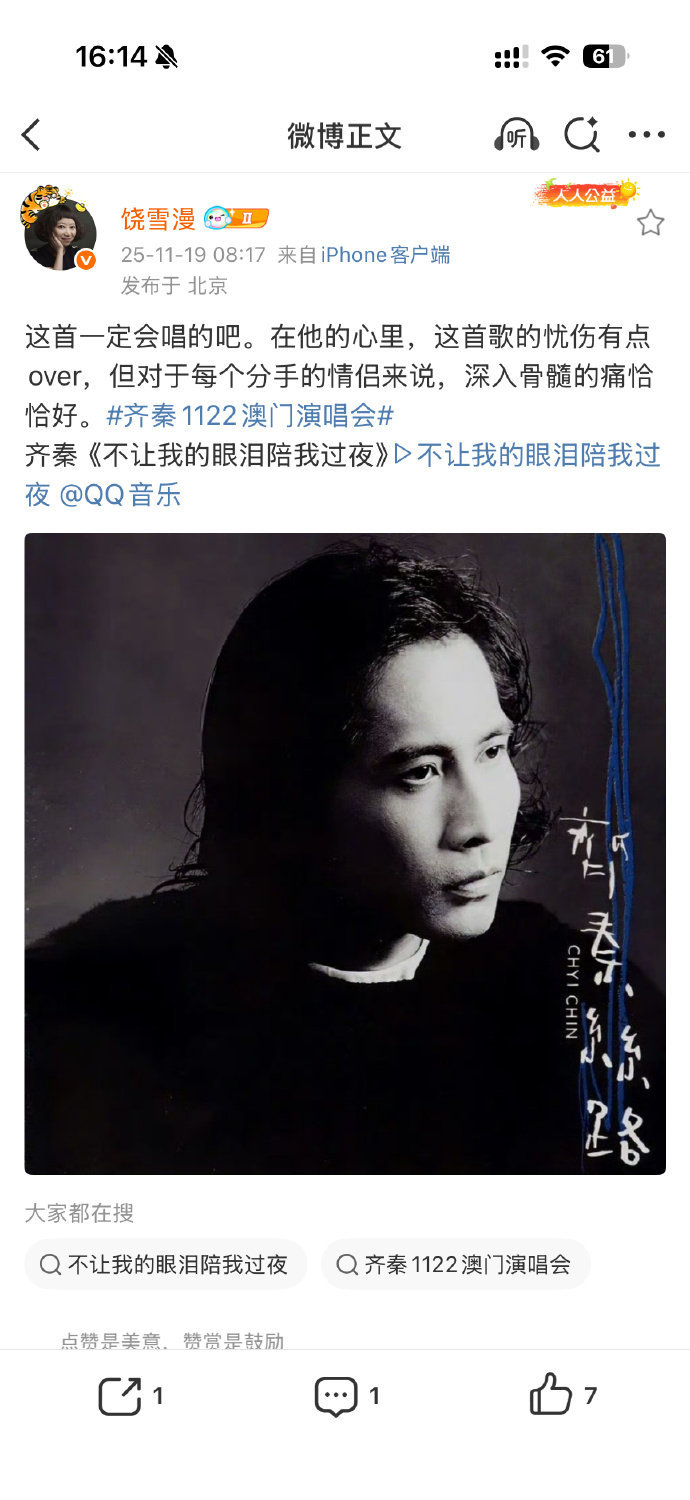 饶雪漫的粉丝属性彻底藏不住!一整天疯狂刷屏齐秦相关,从经典金曲到走心安利,特意cue《大约在冬季 2019》说太戳心,字里行间全是真情实感。这沉浸式追星的样子,像极了我们为偶像按头安利的模样,头号迷妹实锤!