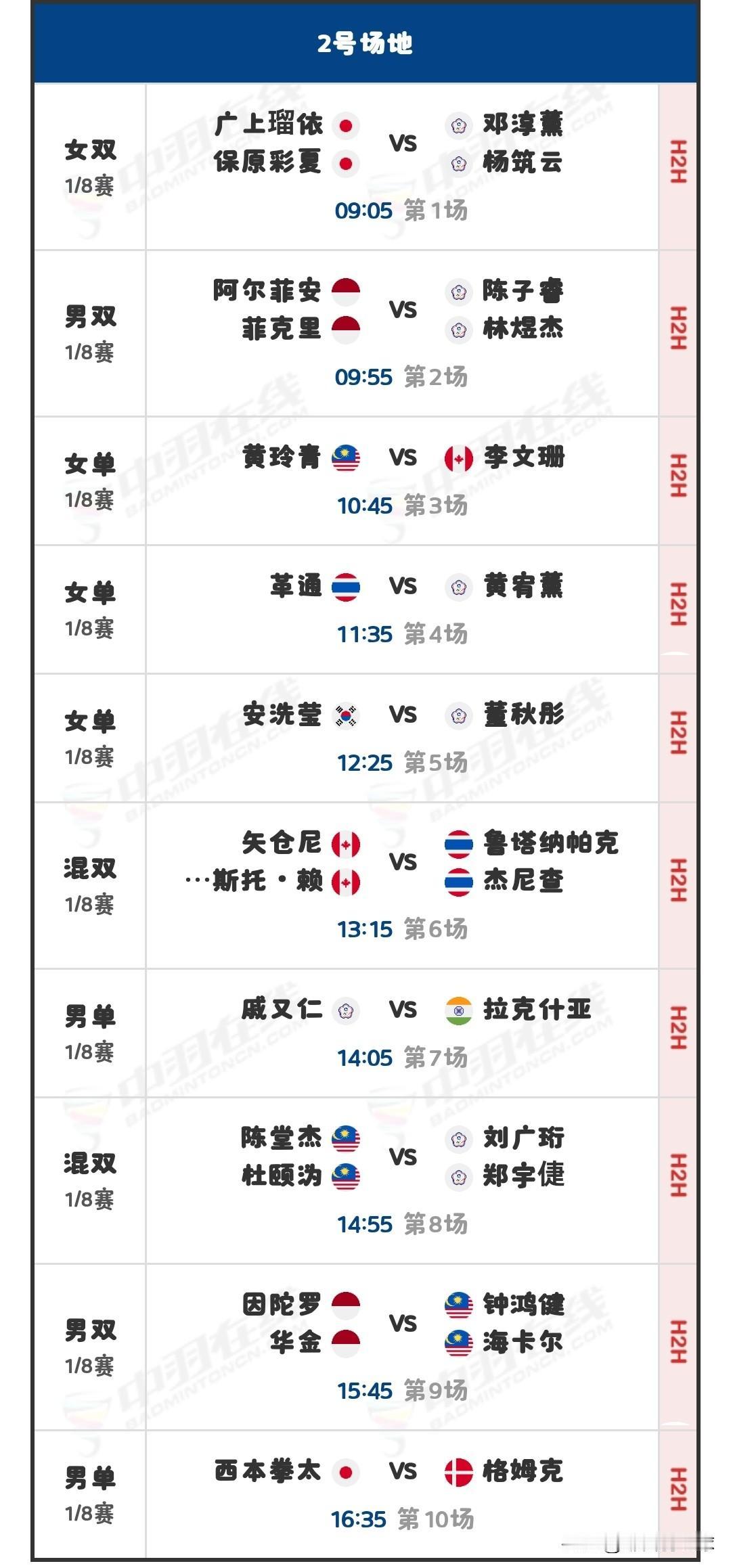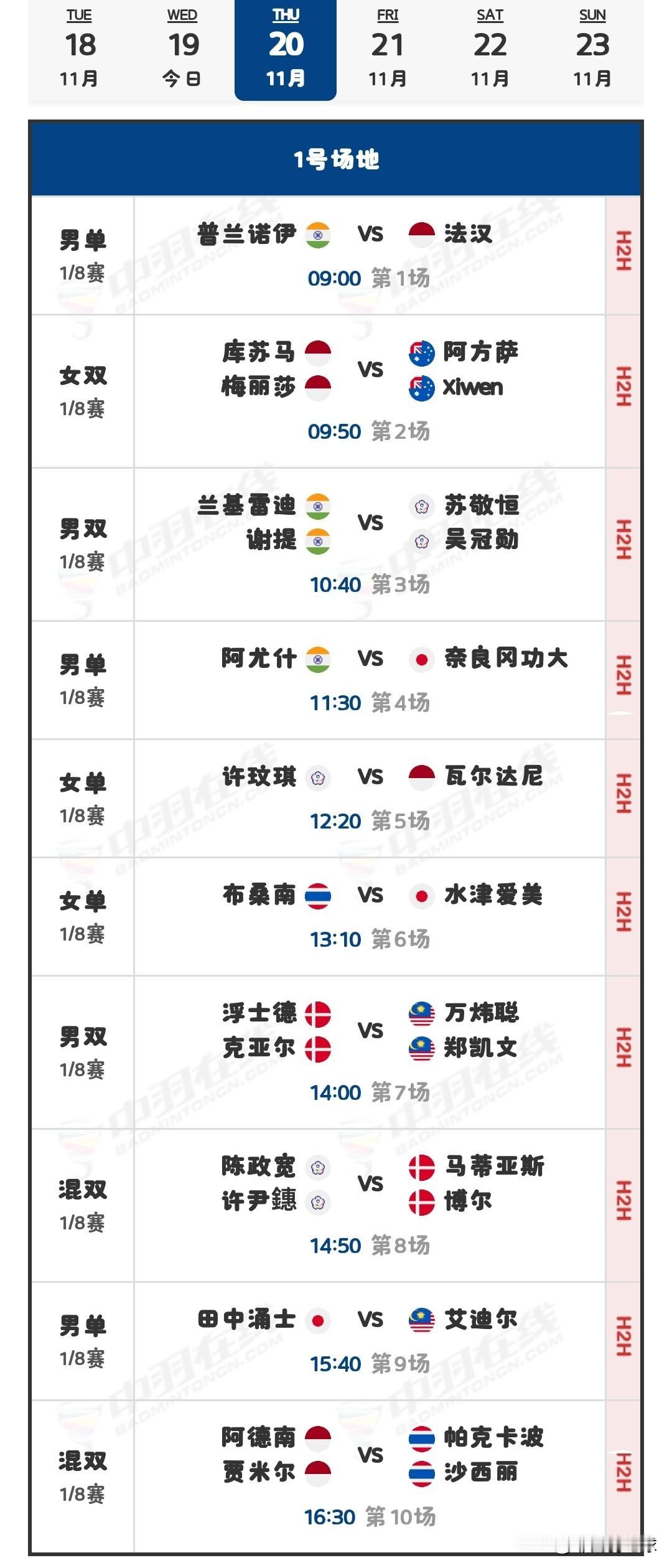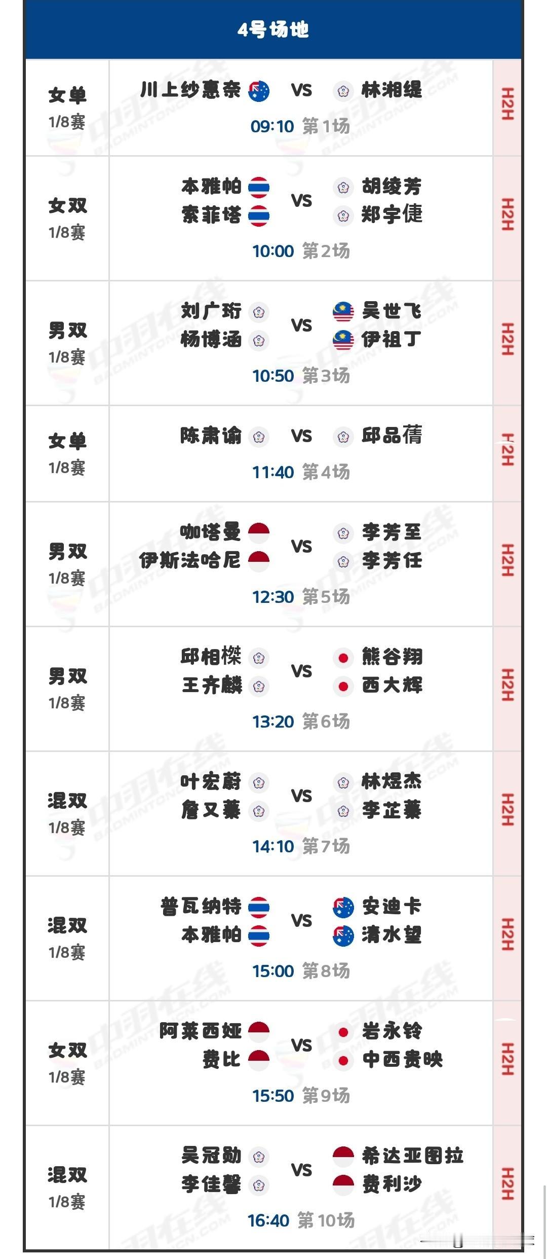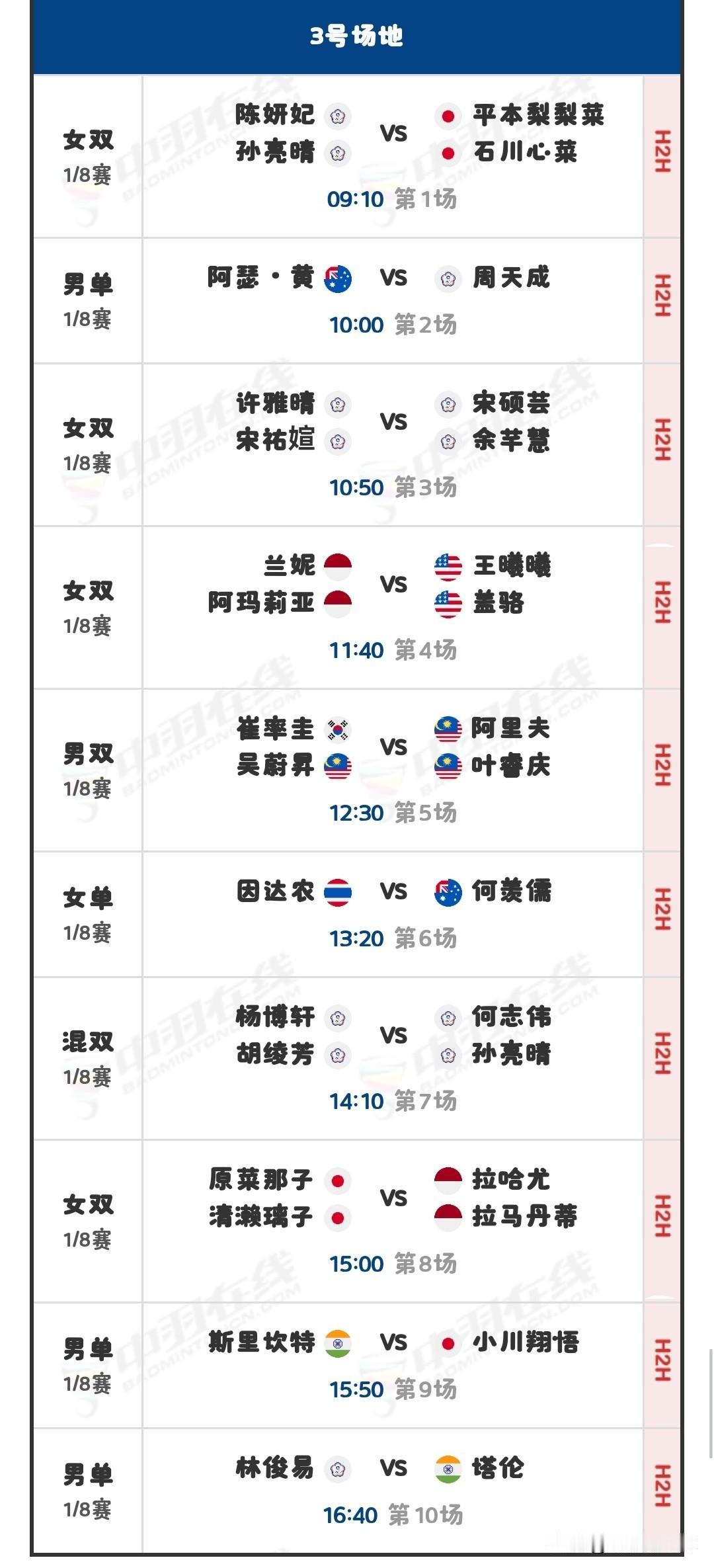 11月20日澳大利亚羽毛球公开赛1/8决赛安排 今日赛事已全部收官。乔纳坦在比赛中连丢两局,不敌田中涌士,首轮即遭淘汰,尤为惊人的是,他在第二局仅拿到7分,爆出当日最大冷门。历经两天的激烈角逐,首轮1/16决赛已全部结束。 明日北京时间09:00,1/8决赛即将打响,届时将有四块场地同时进行比赛。明日的对阵包括普兰诺伊对阵法汉,戚又仁对阵拉克什亚,西本拳太对决格姆克。详细对阵安排如下: 羽毛球 羽毛球爱好者 羽毛球比赛 羽毛球公开赛 羽毛球赛事 2025年澳大利亚羽毛球公开赛