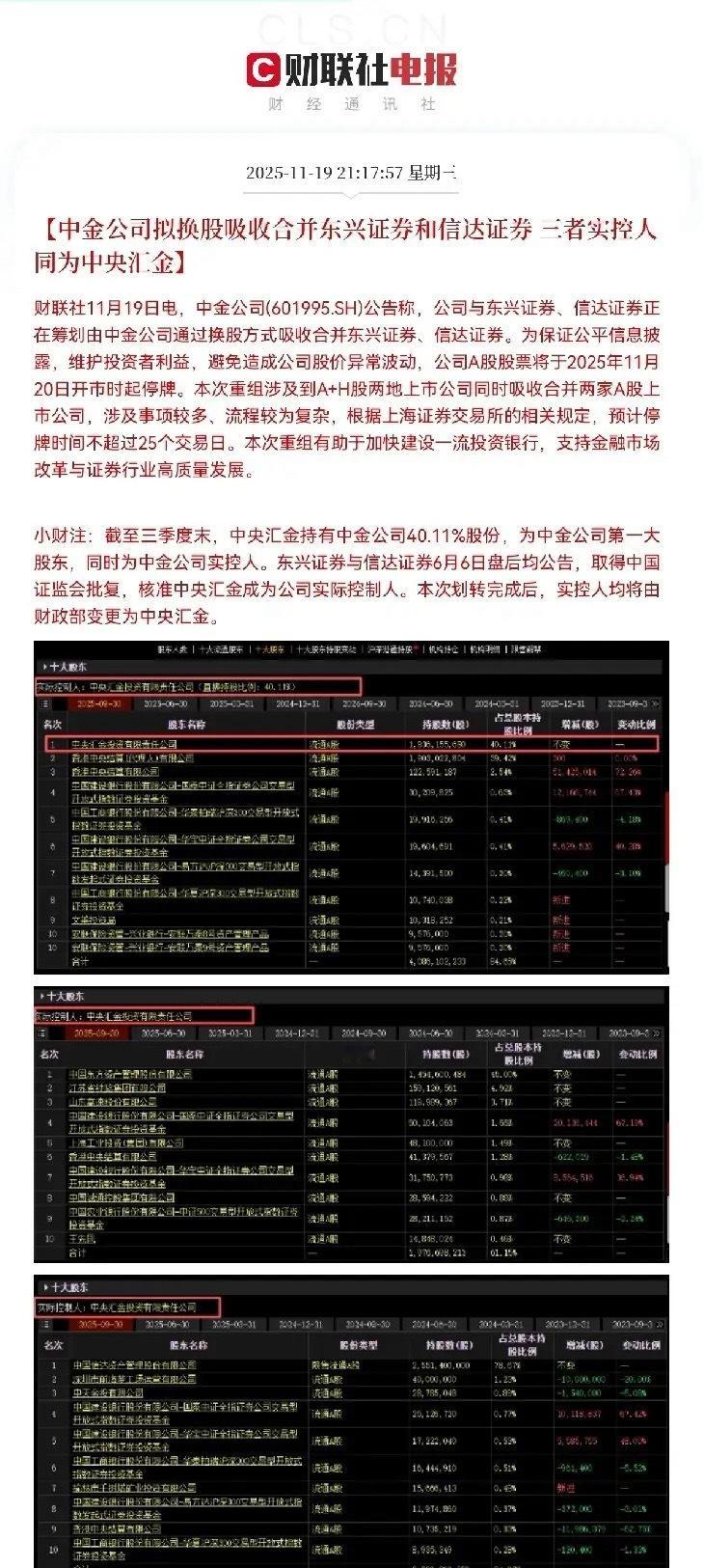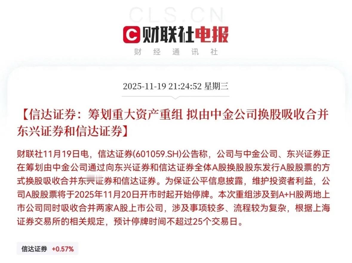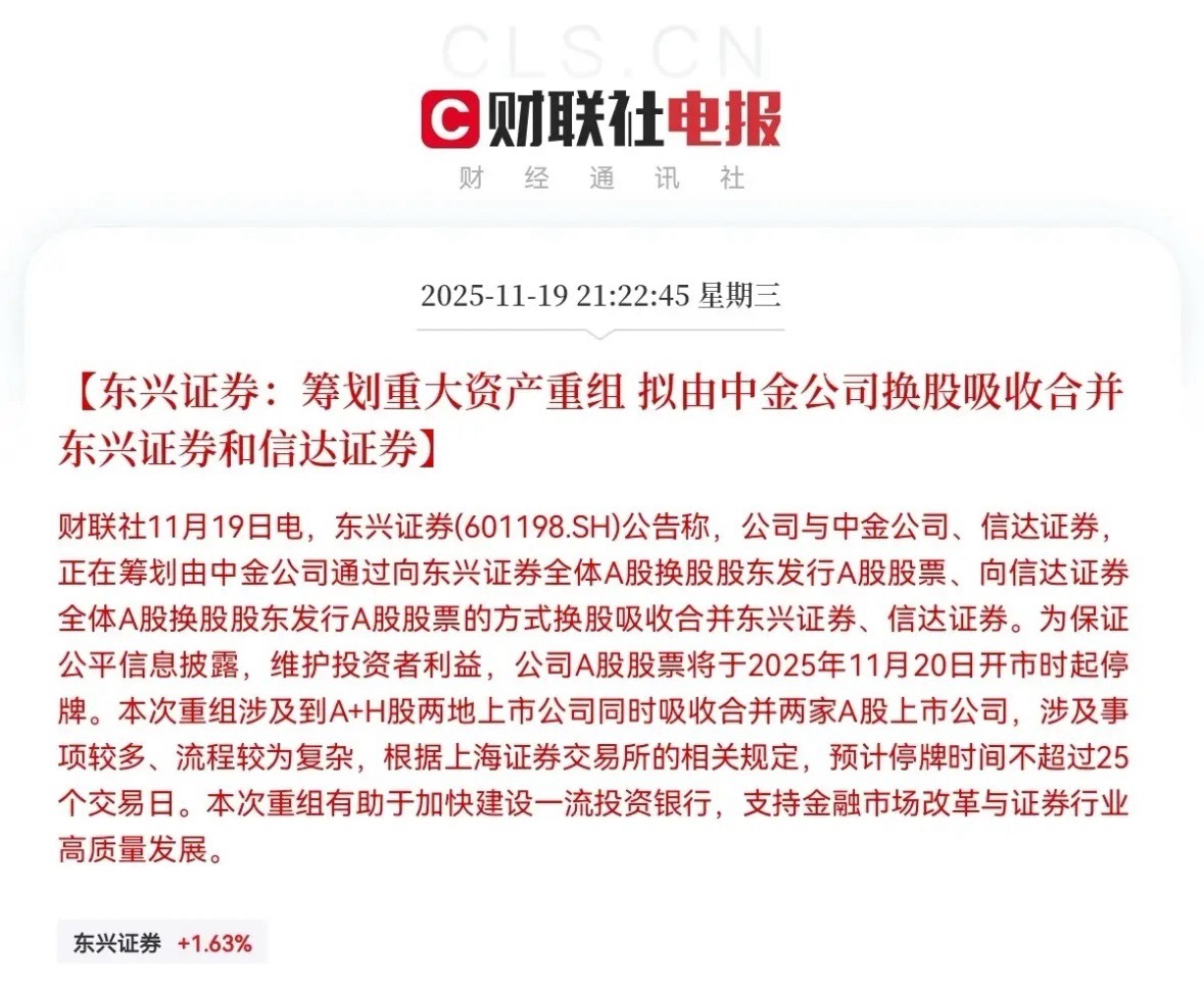 证券板块突发重磅利好消息明日证券板块要起飞了,满仓证券板块的,此刻又要兴奋的睡不着了中金公司、信达证券、东兴证券三大证券同步发布重磅并购重组公告,由中金公司以换股的方式吸收合并东兴证券和信达证券,三家券商公司都于明日停牌,预计停牌时间不超过25个交易日,此重大利好消息一出,股民们都激情澎湃了,都乐开花了,一致认为证券板块整合预期又开始大升温了,接下来大有可能陆陆续续会有一半以上的证券公司会步入并购重组的步伐,证券行业做大做强之路势不可挡,国际一流证券公司将呼之欲出,这对于整个证券行业来说是重大利好股民们,坐稳扶好,证券板块突发利好消息刺激下,证券板块压了这么久,这会恐怕是压不住了,预计明日牛市旗手大概率要冲锋了,高开高走稳了吧…!