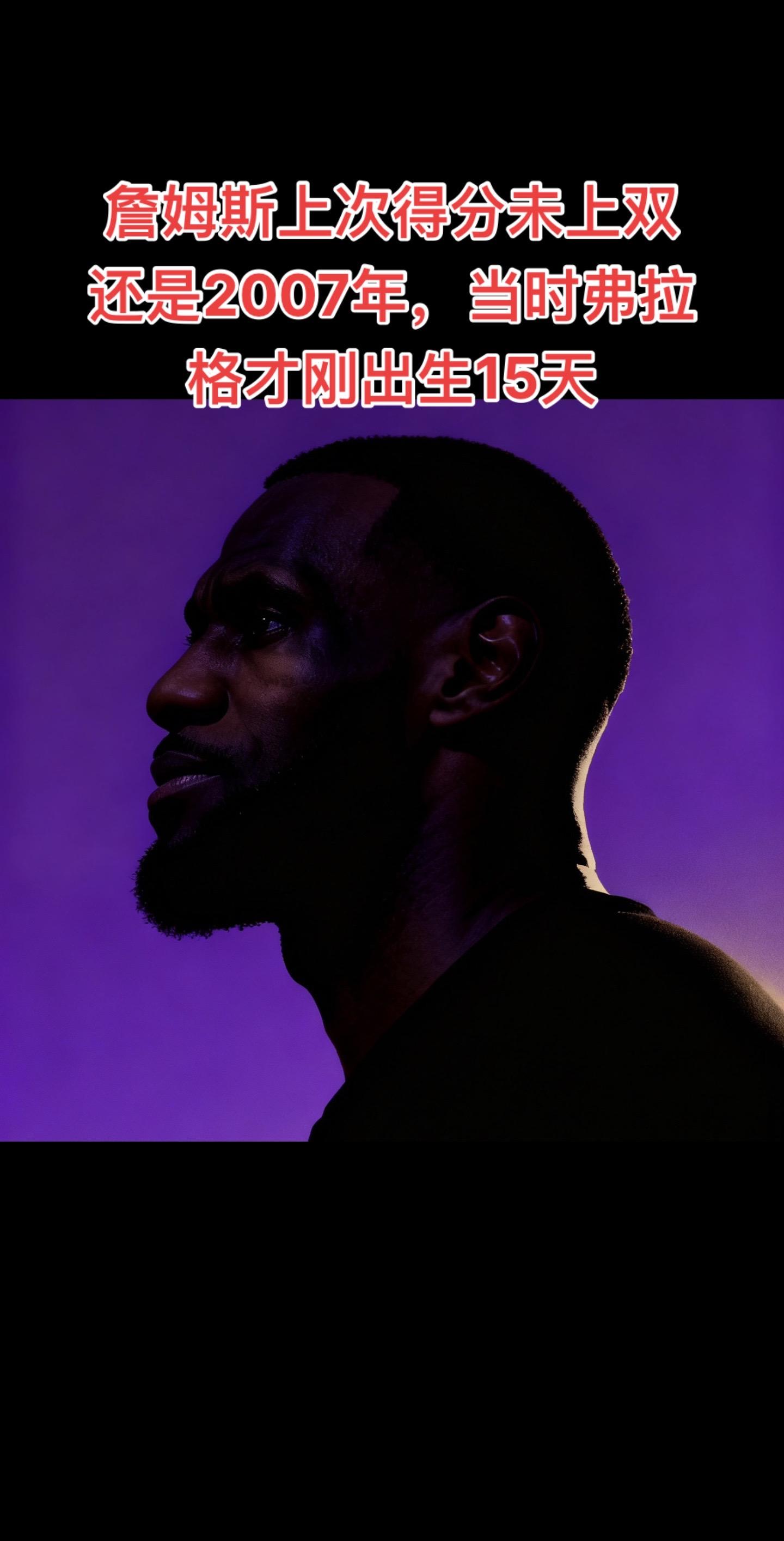 詹姆斯上次常规赛得分未上双是北京时间2007年1月6日(当地时间2007年1月5日) ,他在骑士95 - 86击败雄鹿的比赛中仅得8分。而库珀·弗拉格的出生日期是2006年12月21日 ,算下来到詹姆斯这场比赛时,弗拉格出生刚满15天,这个时间上的巧合十分有趣。詹姆斯詹姆斯第23个赛季篮球来nbamrd先生