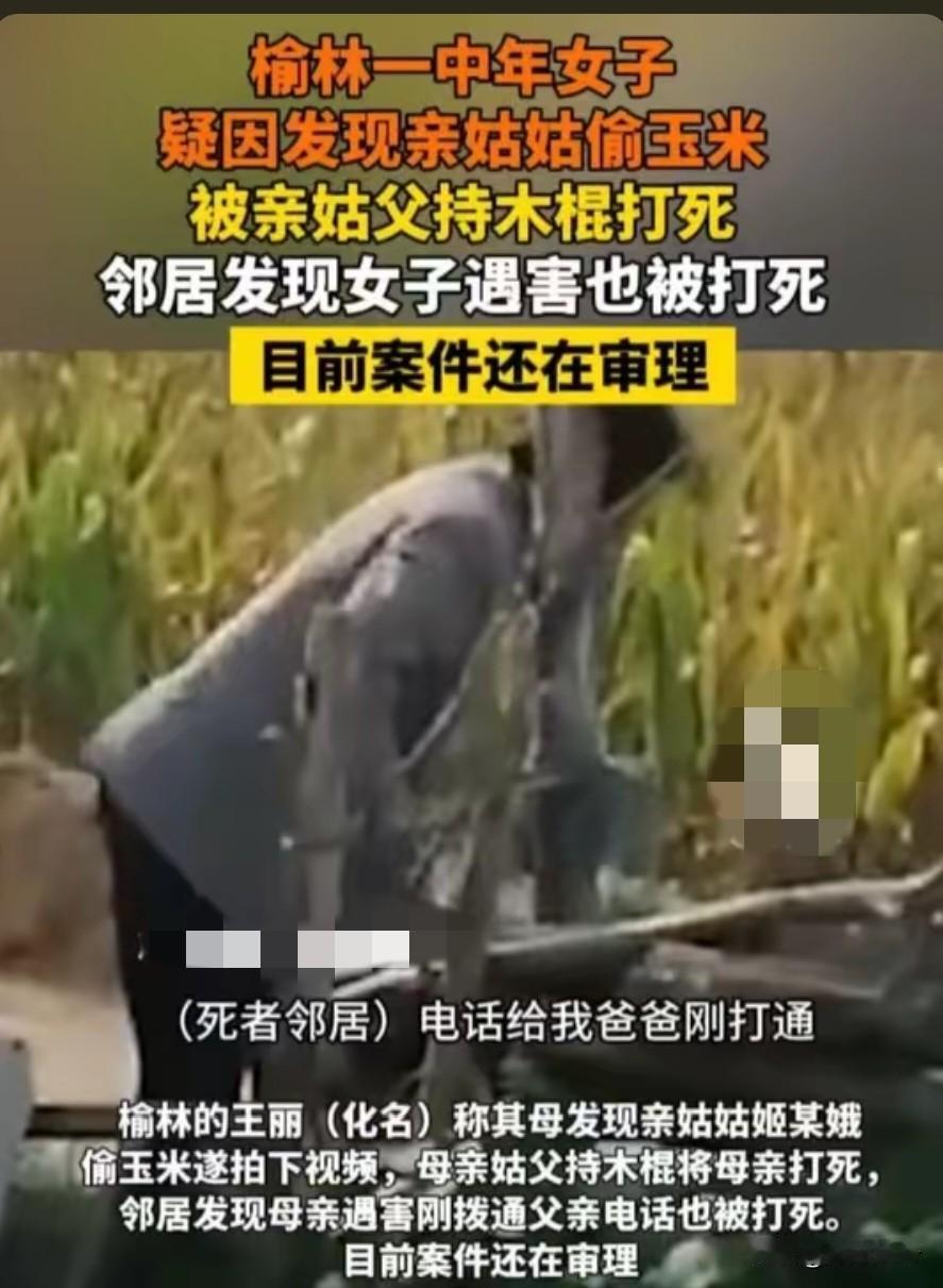 陕西榆林靖边县去年发生了一起让人脊背发凉的血案:55岁的姬国利发现75岁的亲姑姑姬某娥偷自家玉米,举着手机拍视频质问,没想到姑姑的丈夫王某飞抄起手腕粗的木棍,对着她的头猛砸数下,活活把人打死。更让人揪心的是,邻居陈某听见动静赶来,刚拨通姬国利丈夫的电话想报信,也被王某飞残忍杀害。两条人命,就因为几穗玉米没了。 这事儿不是临时起意的冲突,案发时间是2024年5月27号清晨,姬国利本来在自家储草坑旁干活,无意间撞破了姑姑偷玉米的现场。 姬国利女儿后来哭诉,之前家里玉米就老丢,还被姑姑的儿子冤枉过,这次拍视频就是想留个证据,没成想成了催命符。 俩家的关系其实特别近,不只是娘家姑侄,婆家那边姬国利丈夫和王某飞还是表兄弟,在乔沟湾村挨着住了三十多年。 姬国利平时没少照顾这对老人,村里不少人都知道她心眼实,有好吃的好用的都会想着姑姑一家,这份情分按理说该格外珍惜。 冲突是怎么升级的?姬国利拍视频时跟姑姑吵了起来,姬某娥气不过就回了家,直接把丈夫王某飞叫了过来。 王某飞一来就红了眼,抄起旁边手腕粗的木棍,对着姬国利的头一下接一下猛砸,司法鉴定说她是闭合性颅脑损伤,当场就没了气息。 邻居陈大叔听见打闹声跑过来,看到惨状赶紧掏出手机想给姬国利丈夫报信,王某飞居然一不做二不休,拿着同一根木棍又把陈大叔打死了。 就为了掩盖偷玉米的事儿,他硬是夺走了两条鲜活的命,下手是真的没留一点余地。 案发才两个小时,警方就把王某飞抓了,可引发这一切的姬某娥却没被追究刑事责任。 因为她已经75岁,偷玉米的金额没达到刑事立案标准,最后只受了行政处罚,现在还在村里住着,这让姬国利的家人怎么也接受不了。 家人觉得姬某娥是罪魁祸首,要是她不叫丈夫过来,要是她平时不总偷玉米,根本不会出这种事。 但法律上认定教唆犯罪得有实锤证据,得证明她明确让王某飞去杀人,光叫人过来吵架可不算,这也是这起案子的争议点之一。 2025年6月20号榆林中院开庭审理了这起案,王某飞被起诉故意杀人罪,可直到11月都没宣判。 大家都在担心,王某飞年纪看着也不小,要是也超过75岁,会不会因为刑法里“审判时已满75周岁不适用死刑”的规定,逃过最严厉的惩罚。 我真心觉得,这根本不是几穗玉米的事儿,是贪婪和暴力毁了一切。 亲戚邻里之间,就算有利益摩擦,好好沟通总能解决,怎么就能动杀人的念头? 姬某娥长期小偷小摸没人制止,王某飞毫无法律意识,这才让小事酿成了惨剧。 亲情在自私面前变得一文不值,法律的边界在高龄面前也引发了讨论。 该严惩的是暴力犯罪,该规范的是日常行为,不能让“亲情”“年龄”成为伤害他人的挡箭牌。 各位读者你们怎么看?欢迎在评论区讨论。