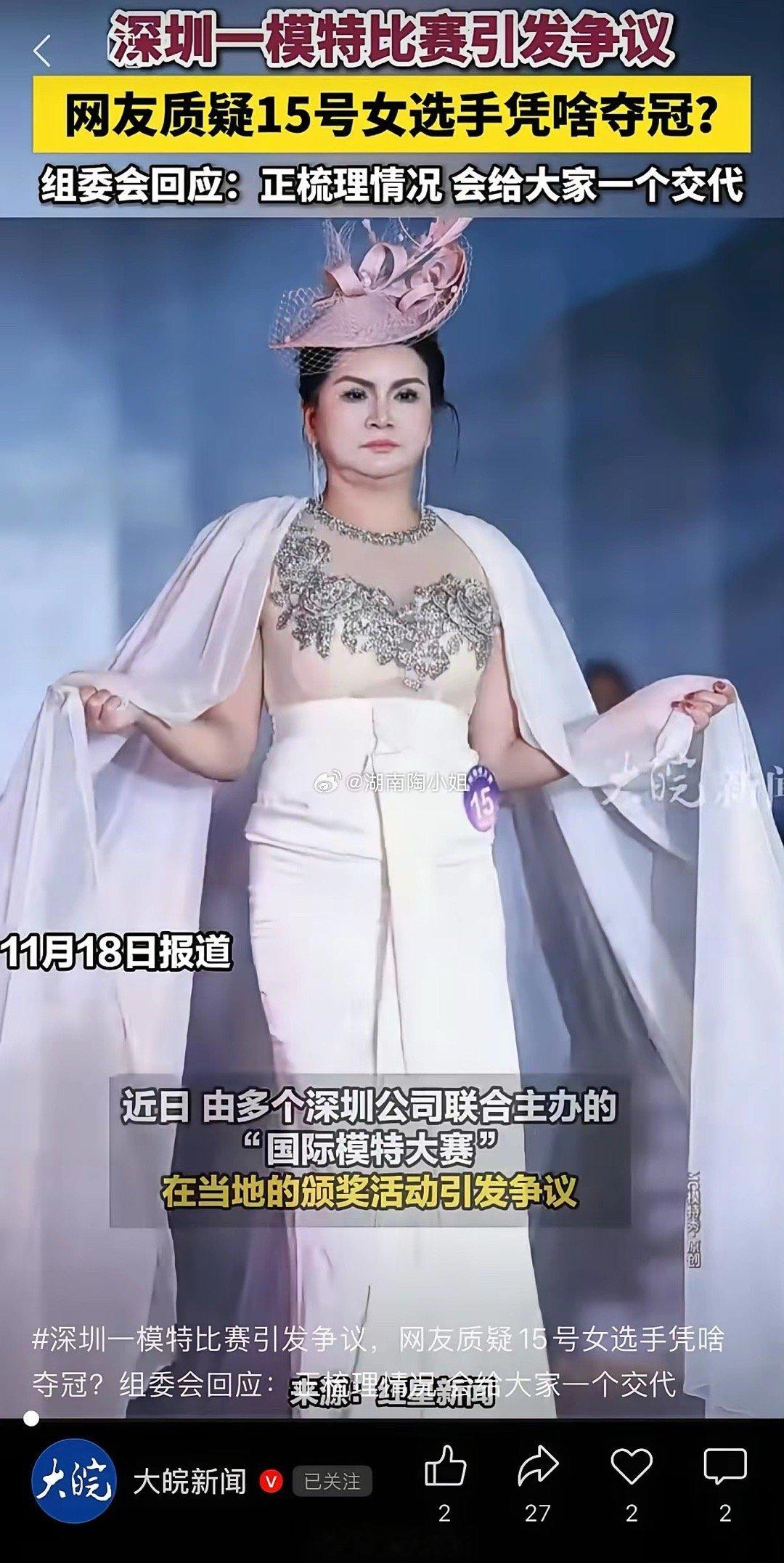 深圳一模特比赛引发争议,网友质疑15号女选手凭啥夺冠?组委会回应:正梳理情况 会给大家一个交代