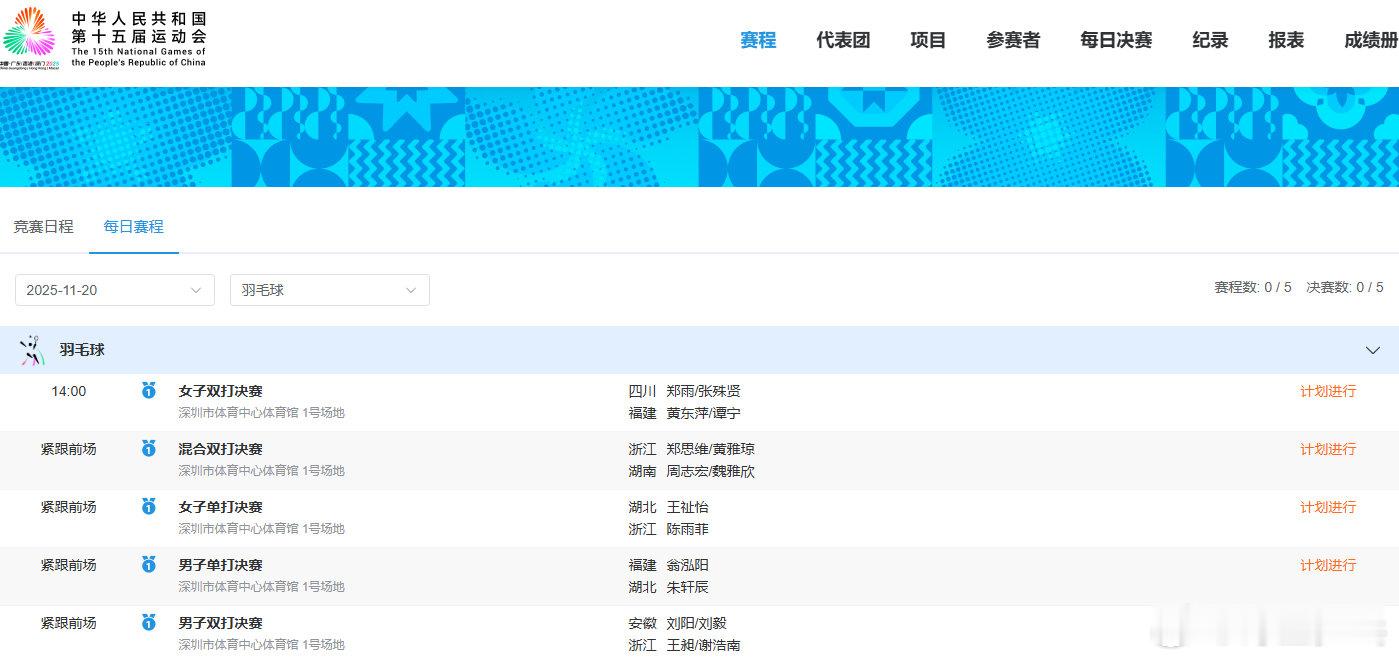 2025年全运会羽毛球项目今日收官,14:00起将决出单项5金女子双打决赛 郑雨/张殊贤VS黄东萍/谭宁混合双打决赛 郑思维/黄雅琼VS周志宏/魏雅欣女子单打决赛 王祉怡VS陈雨菲男子单打决赛 翁泓阳VS朱轩辰男子双打决赛 刘阳/刘毅VS王昶/谢浩南