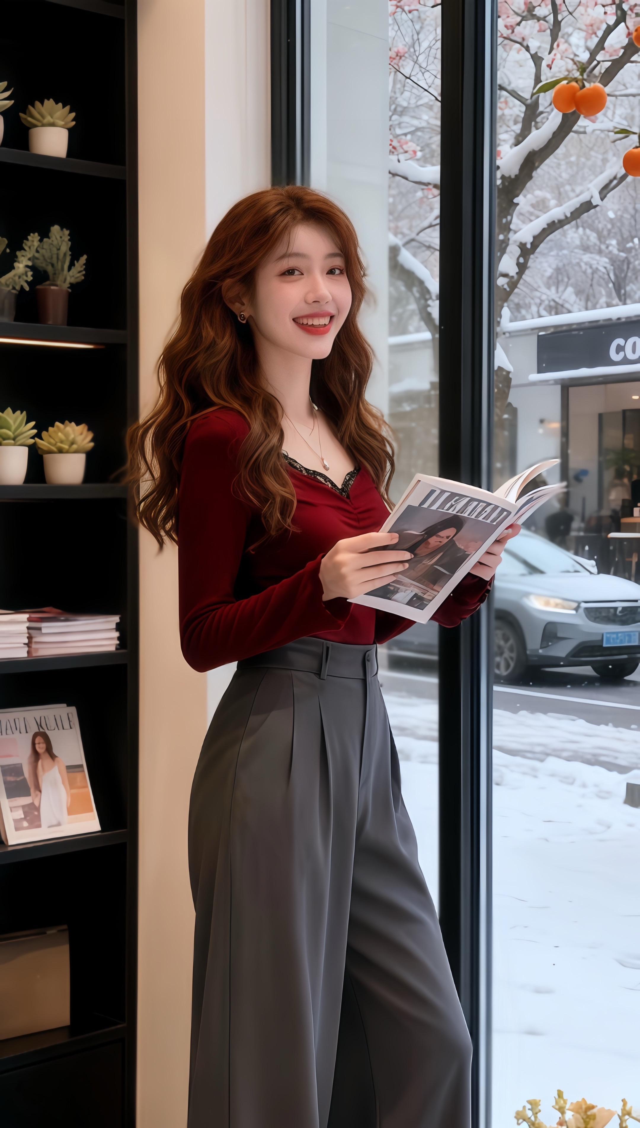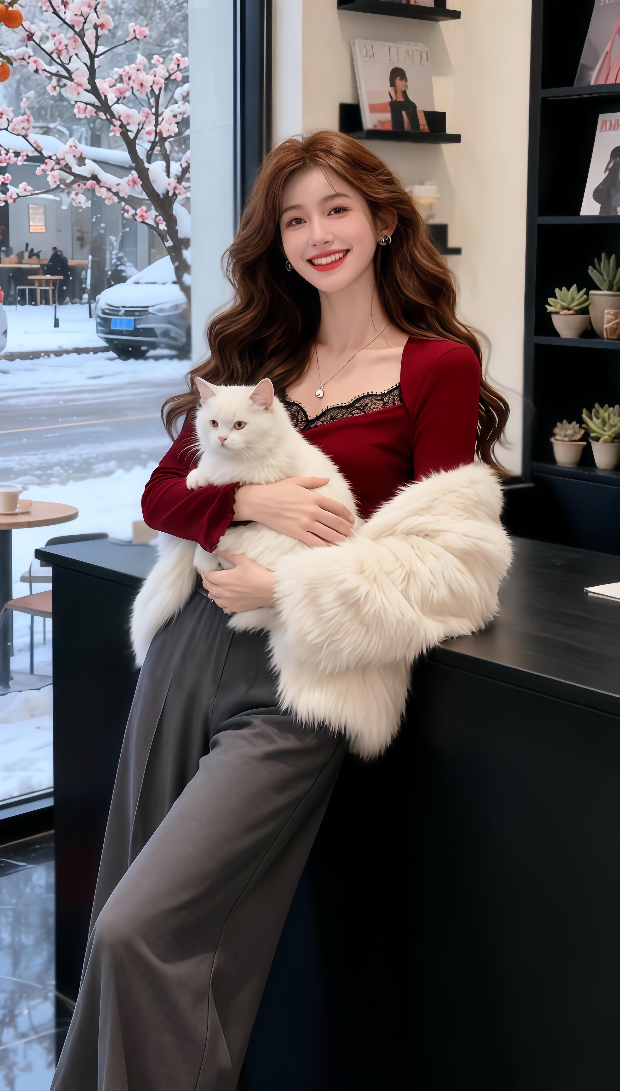 雪落满街那天,我在橱窗看见那件酒红蕾丝衫——像把冬天的壁炉裁成了布料,裹在身上连指尖都暖。配灰调阔腿裤,是咖啡店落地窗前捧热拿铁的松弛,也是抱着白猫时衣摆垂落的软。
