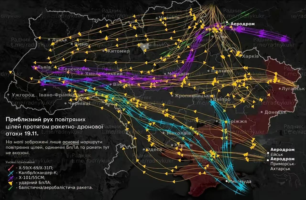 看着这无人机和导弹飞行轨迹图,俄军是真狠呐!当地时间11月19日凌晨,俄军对乌克兰又来了一次全境大轰炸,这是要决心打垮乌克兰人民和乌军的斗志啊。挨了这么多轮次轰炸,乌克兰缺电、缺气、缺武器,冬天很冷,乌克兰人的日子很艰难!