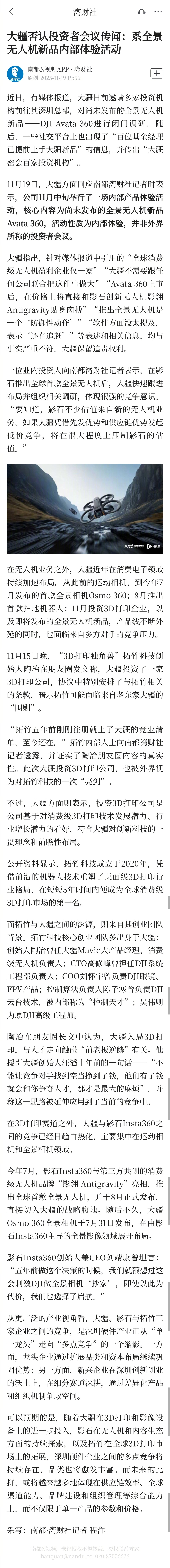 【大疆否认投资者会议传闻:系全景无人机新品内部体验活动】近日,有媒体报道,大疆日前邀请多家投资机构前往其深圳总部,对尚未发布的全景无人机新品——DJI Avata 360进行闭门调研。随后,一些社交平台上也出现了“百位基金经理已提前上手大疆新品”的信息,并传出“大疆密会百家投资机构”。11月19日,大疆方面回应南都湾财社记者时表示,公司11月中旬举行了一场内部产品体验活动,核心内容为尚未发布的全景无人机新品Avata 360,活动性质为内部体验,并非外界所称的投资者会议。大疆指出,针对媒体报道中引用的“全球消费级无人机盈利企业仅一家”“大疆不需要跟任何公司联合把这件事做大”“Avata 360上市后,在价格上将直接和影石创新无人机影翎Antigravity贴身肉搏”“推出全景无人机是一个‘防御性动作’”“软件方面没太提及,表示‘还在追赶’”等表述和相关信息,均与事实严重不符,大疆保留追责权利。一位业内投资人向南都湾财社记者表示,在影石推出全球首款全景无人机后,大疆快速跟进布局并组织相关调研,体现很强的竞争意识。“要知道,影石不少估值来自新的无人机业务,如果大疆凭借先发优势和供应链优势发起低价竞争,将在很大程度上压制影石的估值。”