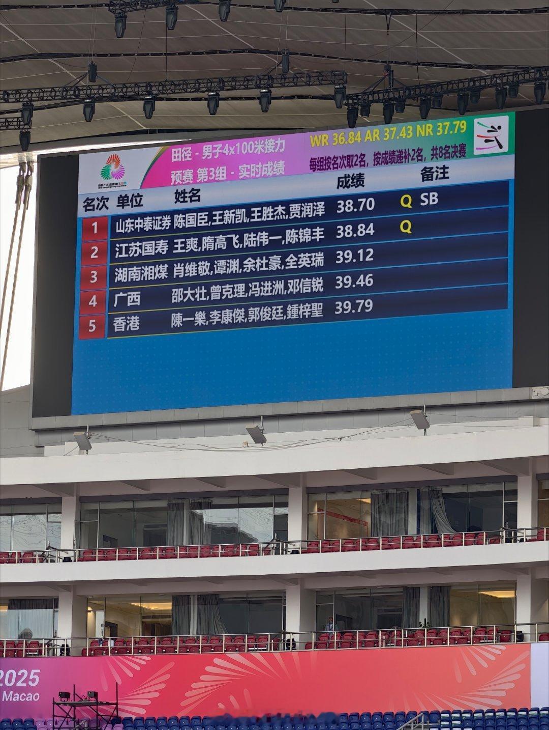 男子4×100米接力预赛第二组,江西、四川直接晋级,广东队39秒22等待两个最好