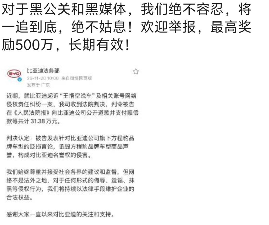 比亚迪打击黑公关和黑媒体又出新成果了!比亚迪法务部发文,就比亚迪起诉“王悟空说车”及相关账号网络侵权责任纠纷一案的判决结果做了说明。 “判决认定:被告发表针对比亚迪公司旗下方程豹品牌车型的贬损言论,诋毁方程豹品牌车型商品声誉,构成对比亚迪名誉权的侵害。” 判决结果就是,法院判令被告在《人民法院报》向比亚迪公司公开道歉并支付赔偿款等共计31.38万元。 同时比亚迪表示,尊重并接受社会各界建议和监督,但对于摸黑,造谣,侮辱等侵权行为绝不姑息。 同时比亚迪再次重申,对于黑媒体和黑公关绝不容忍,将一追到底。也欢迎举报,最高奖励500万,长期有效。 在这里还是想说,对比产品和品牌的评判还是得靠事实说话,基于客观真实观点的评价或者建议都是没问题的,大家都能接受。但是别有用心,为了黑而黑,或者收了钱去黑,那就是对自己和他人都不负责任的行为了。 总之就是一句话,网络不是法外之地,还是要用事实说话,用客观数据说话才好。【来自懂车帝车友圈】