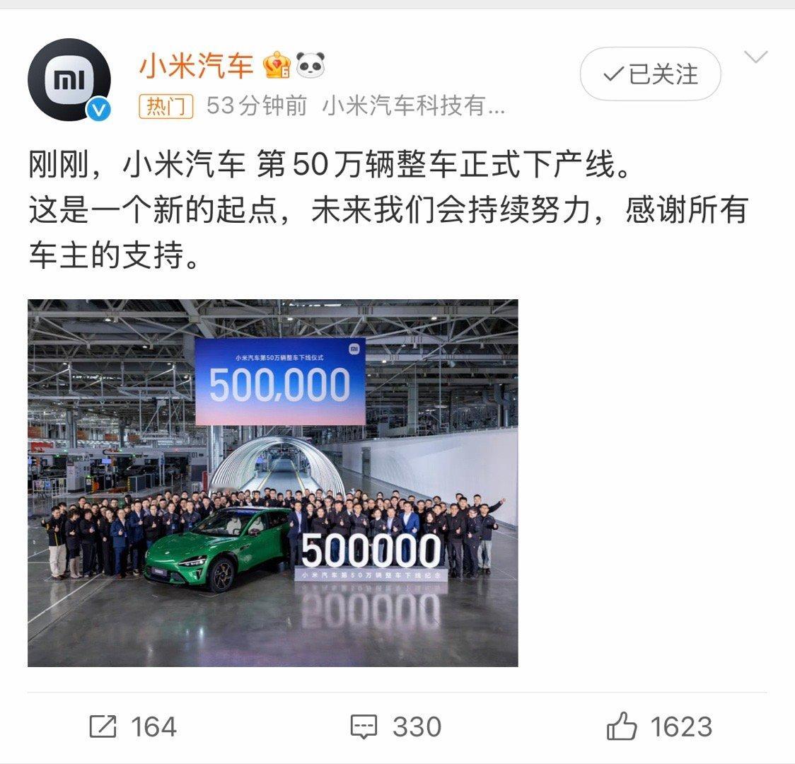 如果我没记错,才二年不到,就下线50W辆。这速度,这销量杠杠,牛逼牛逼。小米汽车第50万辆整车正式下产线,100万还会远吗?