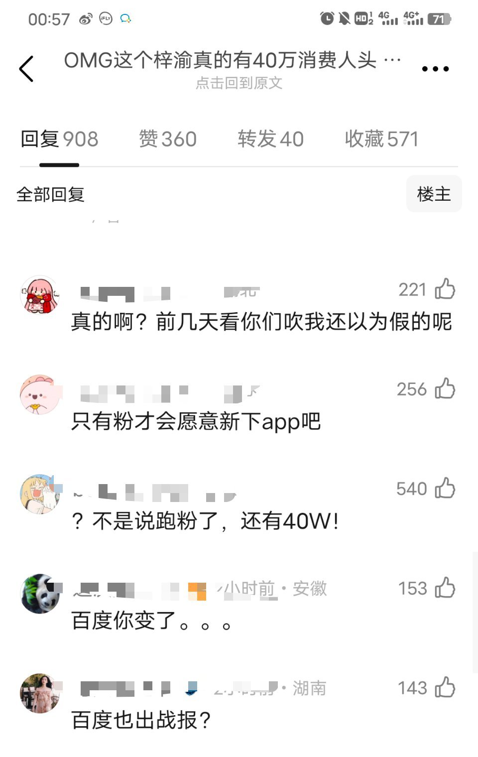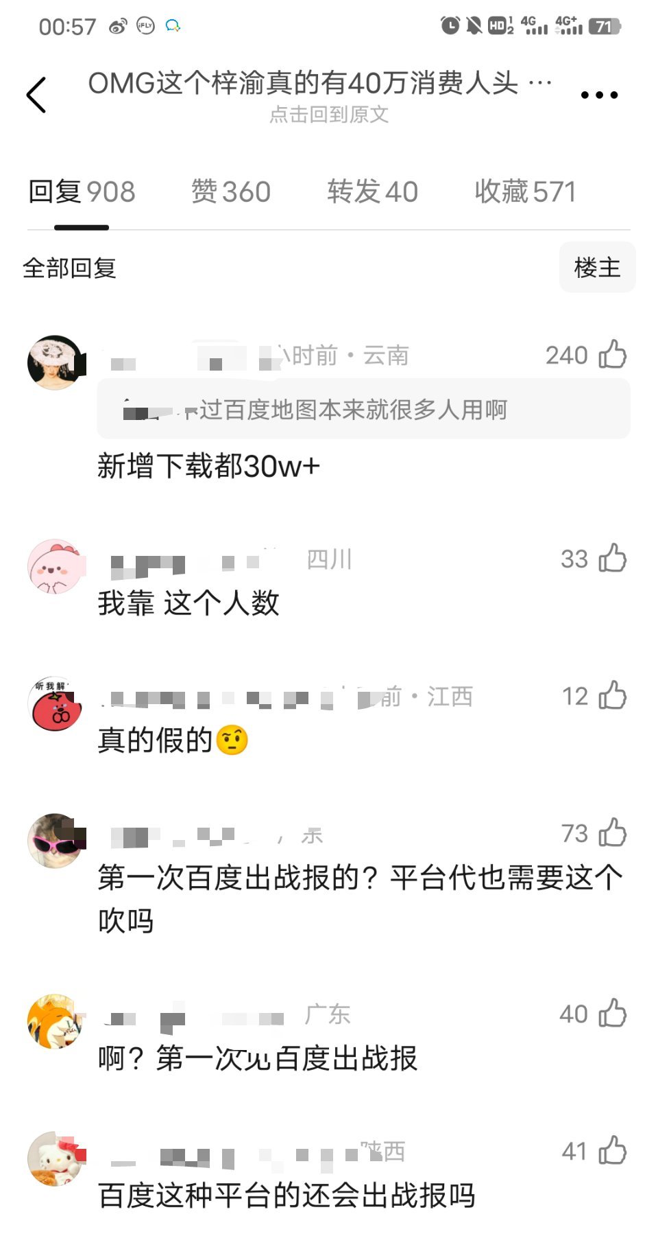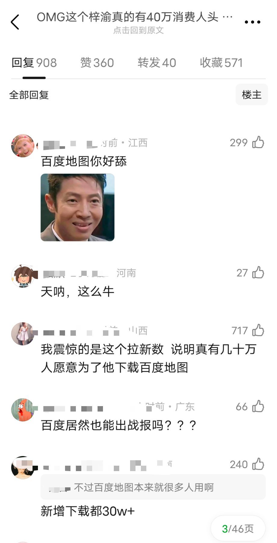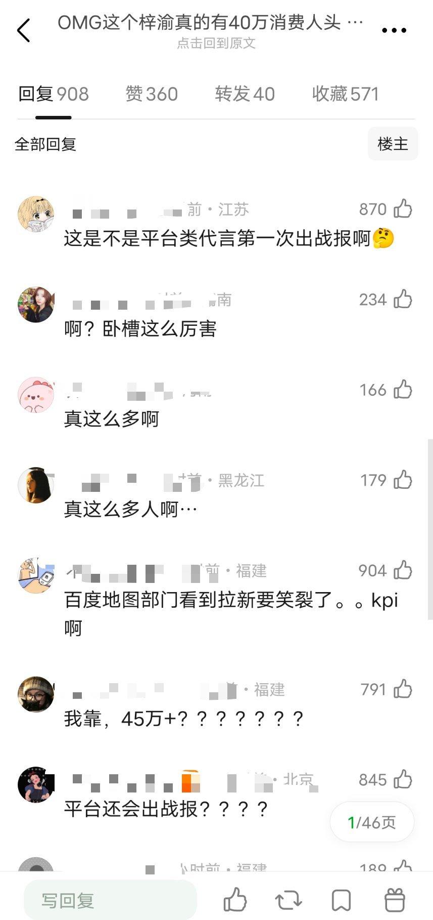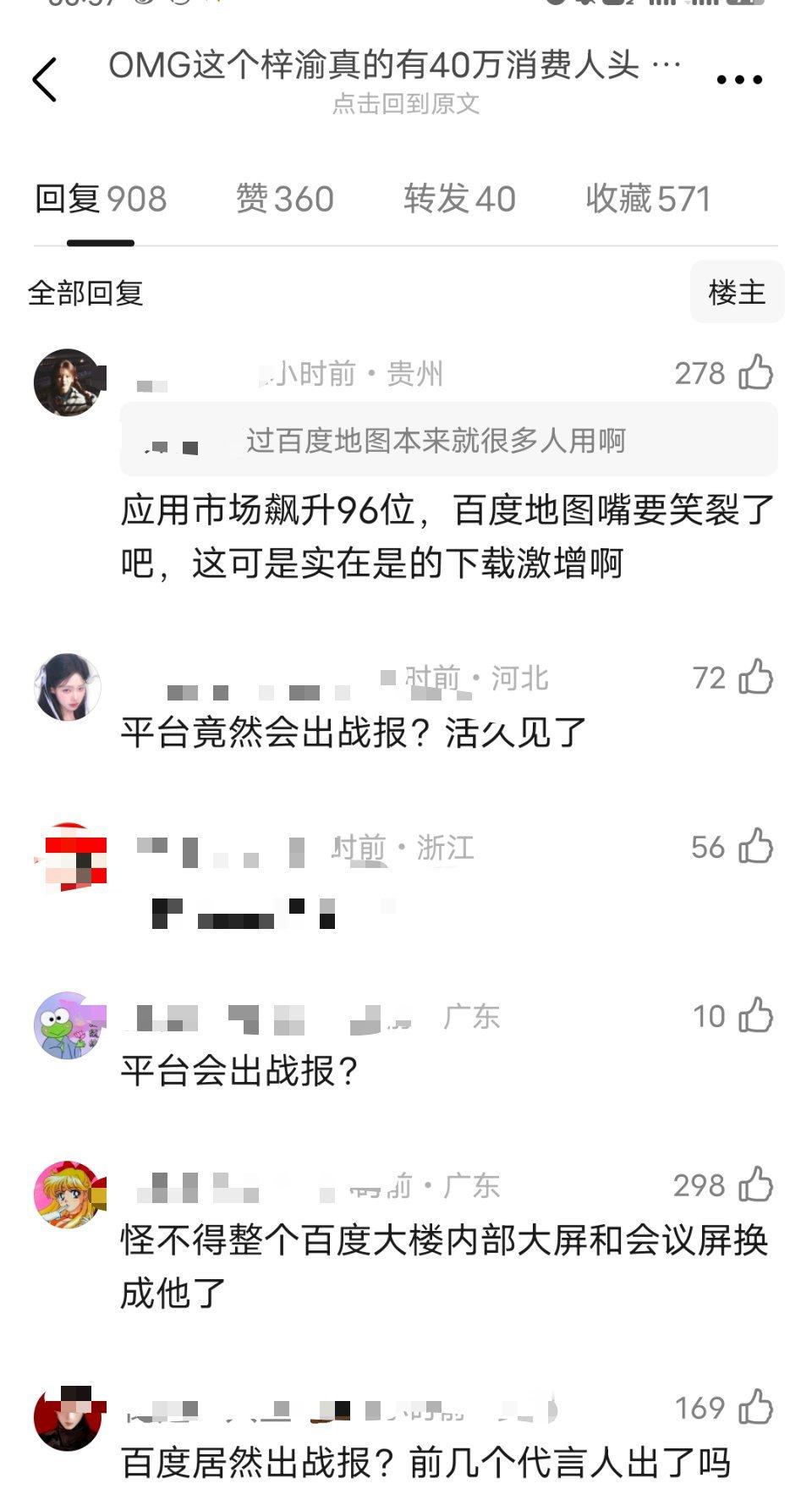 百度地图战报红稿一则,这次更重要的点在于单价18的语音包能卖出40万份720万➕,是有30万的完全新用户愿意为了梓渝下载这个APP进行使用,APP在意的就是拉新量,这次真的完全可以看得出来梓渝的号召力有多强了