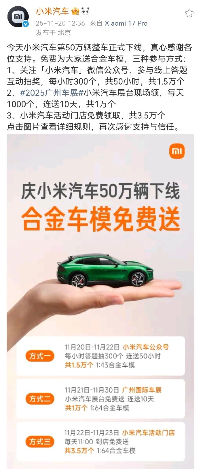 为庆祝小米汽车50万辆车下线!小米向全国送出6万个铝合金车模! 小米这一次参与的方式非常的简单,1.5万个是在线上就可以参与抽奖,1万个是在广州车展现场发放,另外3.5万个是在小米汽车各门店发放。 小编已经参与了第1个线上抽奖,目前还没有中奖,看了一下小米公众号的阅读量都是10万加的水平,想必参与的人也非常的多。 各位是怎么看的?欢迎评论区留言。