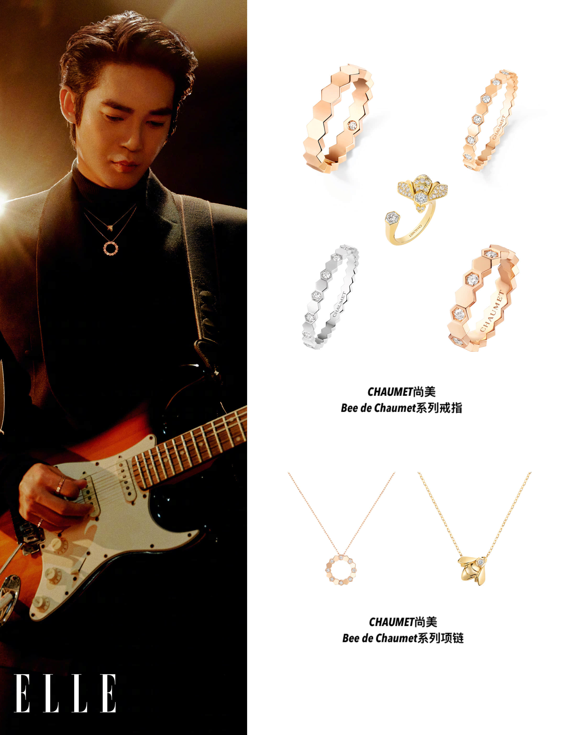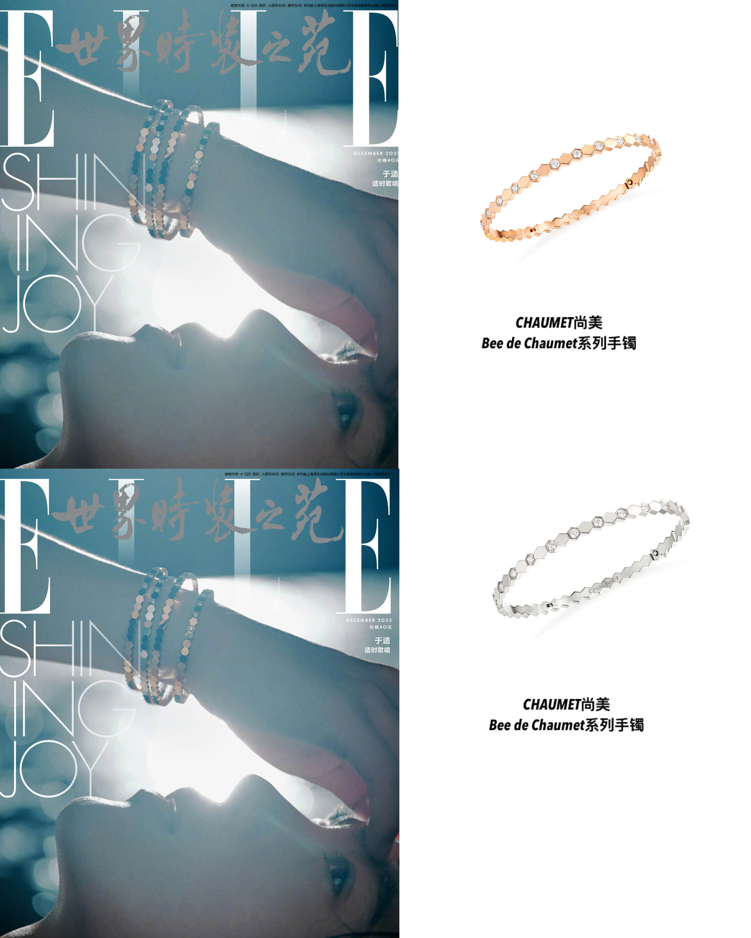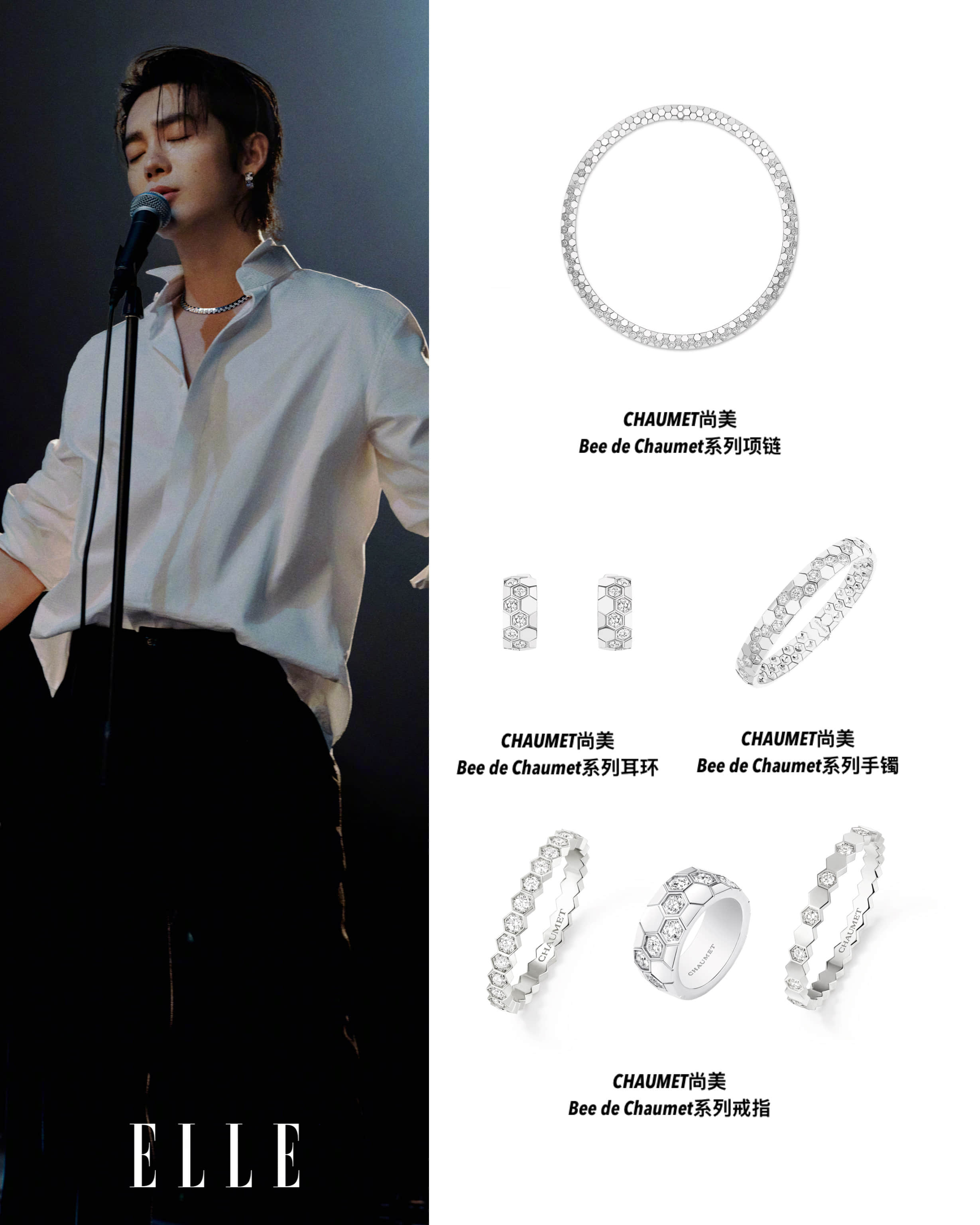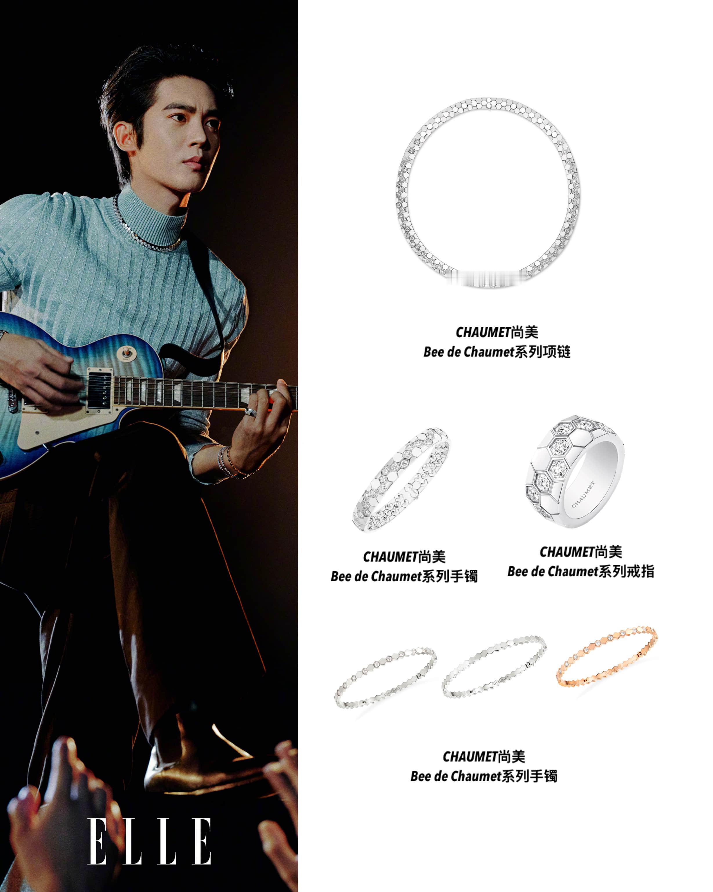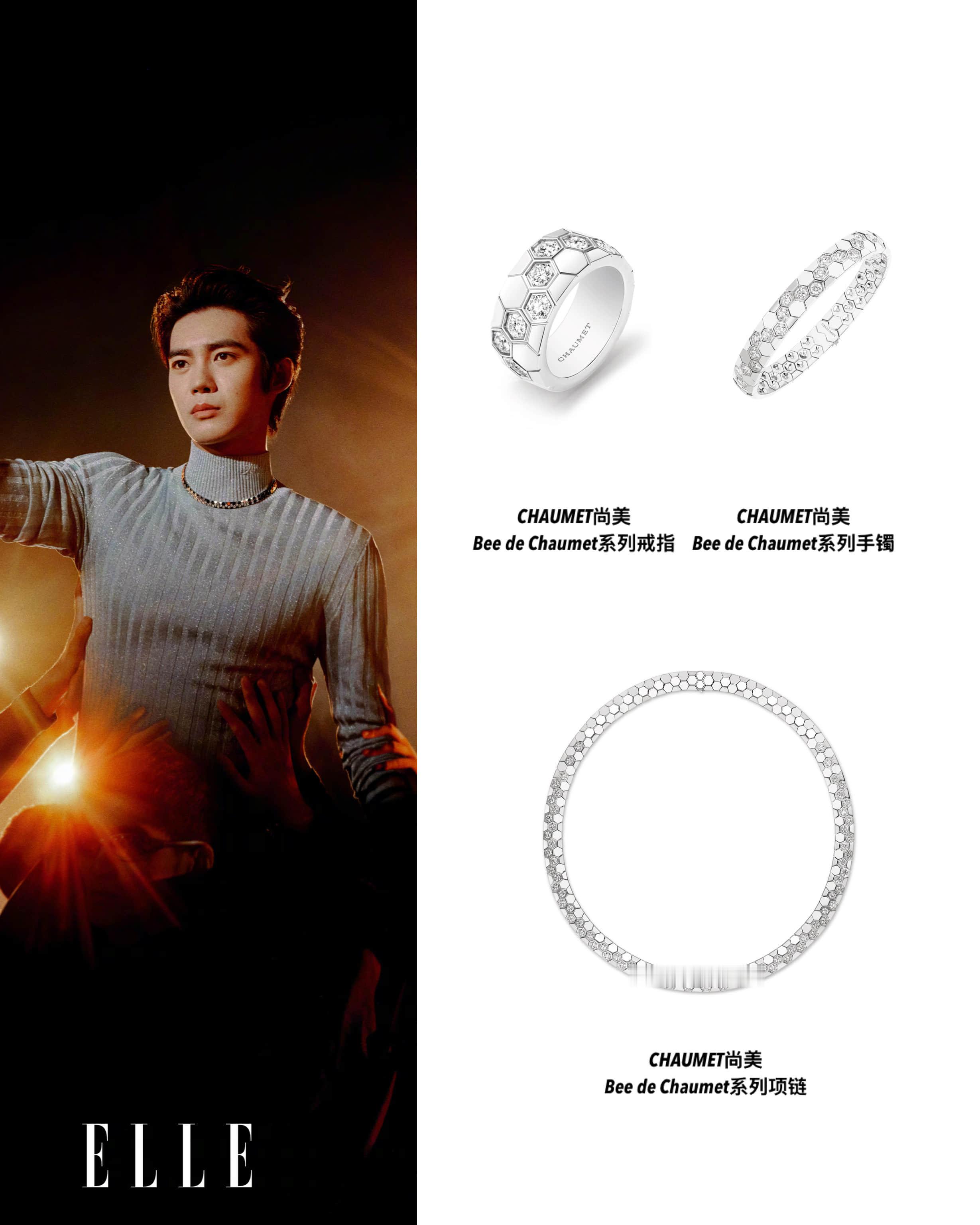 作为青年演员兼音乐人,CHAUMET 品牌大使于适此次饰以“小蜂巢”Bee de Chaumet系列,登上《ELLE》十二月闭年刊,以“沉浸式演唱会”的概念构筑他的舞台宇宙:或手握麦克风沉浸于旋律,或投身人群纵情释怀,每一帧都在光束与音浪交织中,呈现他不被定义的舞台“蜂格”,也传递出个体与集体共鸣共振、彼此照亮的闪耀力量。Bee de Chaumet系列设计极具图形美感,结合自然灵感与几何设计的六边形图案相互连接,无限延伸,仿佛无穷无尽,象征着群体力量和个体闪耀间的紧密联系。多样金质与钻石交相辉映,令珠宝散发无与伦比的绚丽光影,赋予佩戴者无限 “蜂”芒,将他在舞台上的能量与韧劲,凝于此刻共鸣共振的音符交响✨