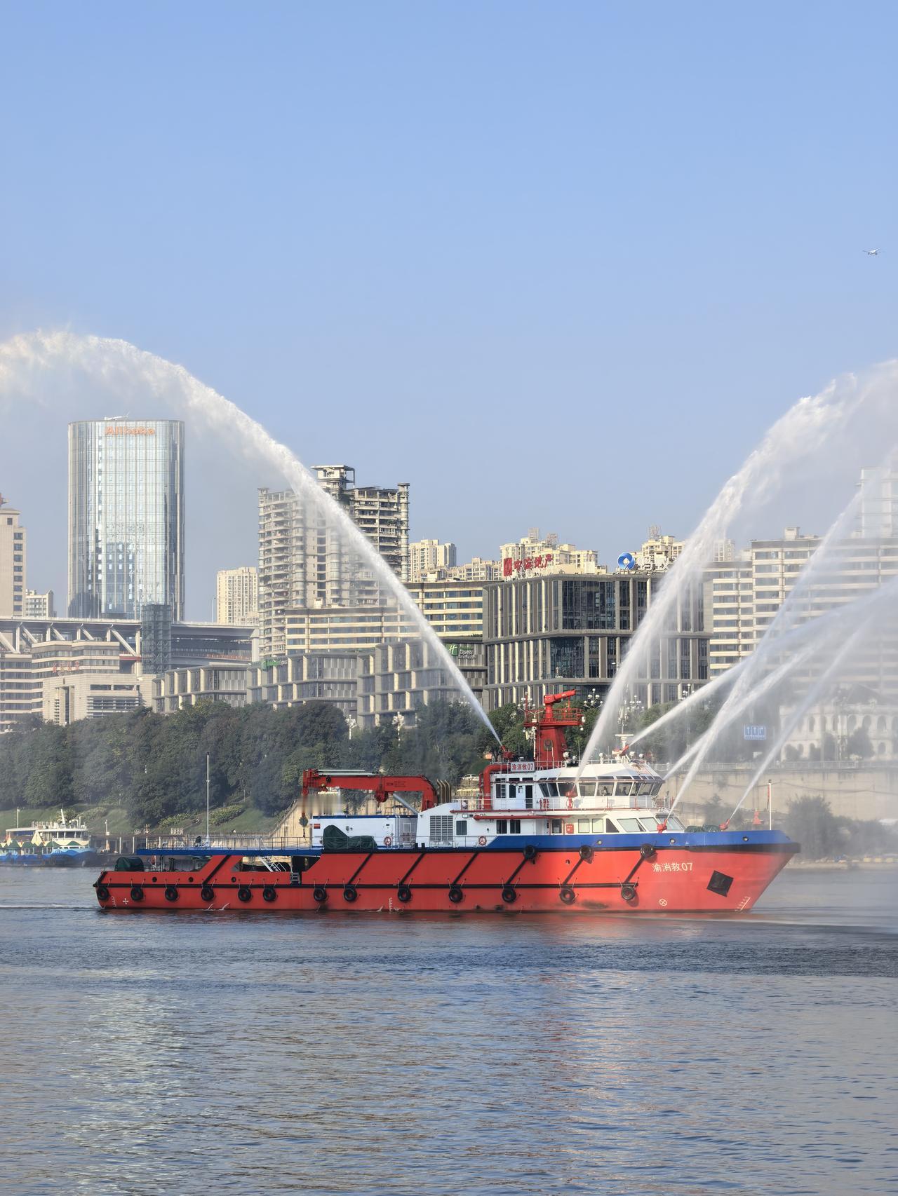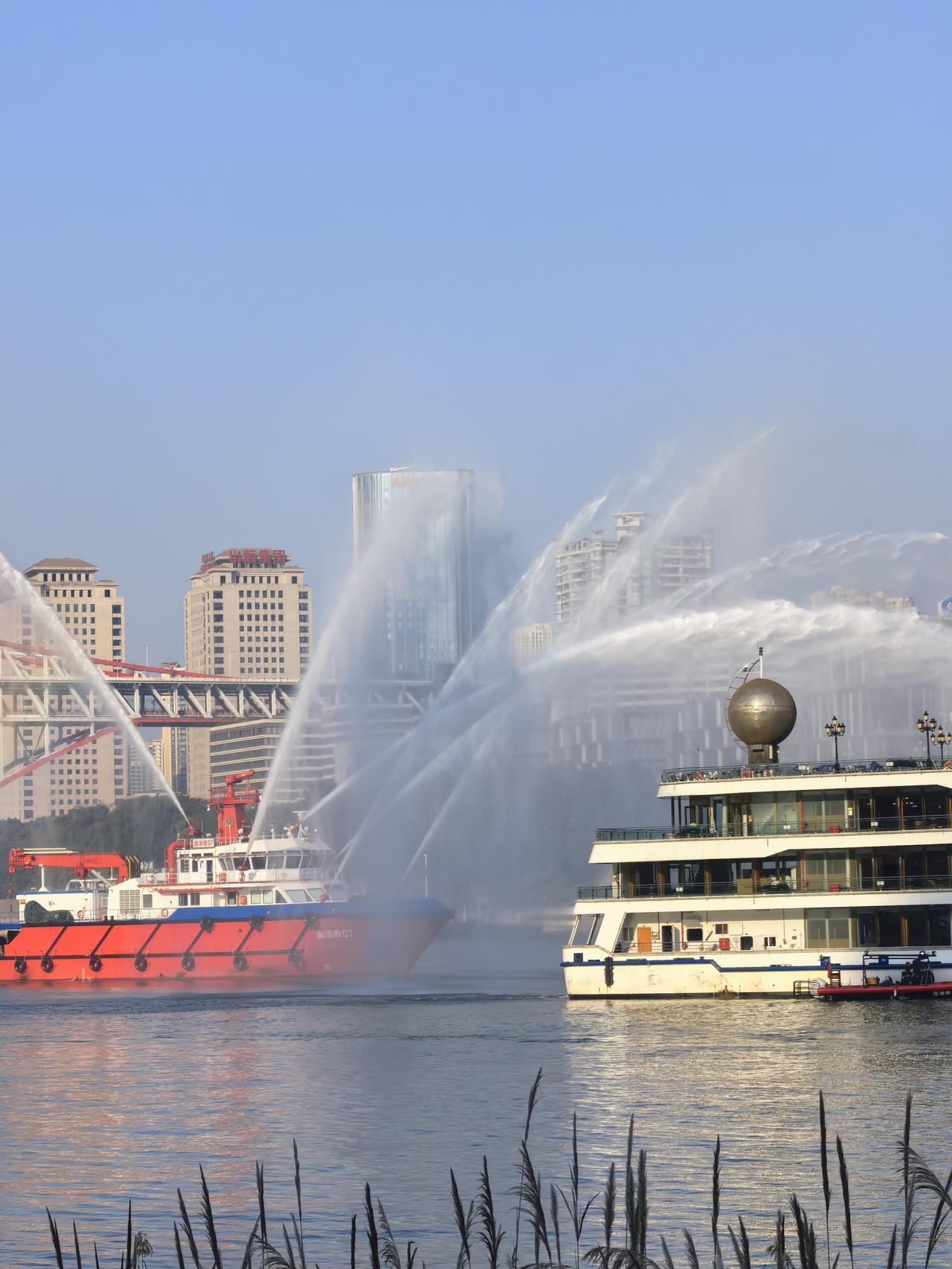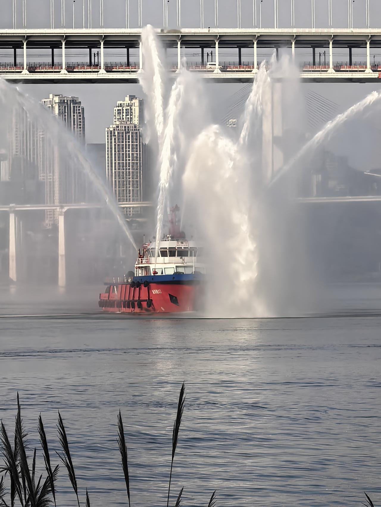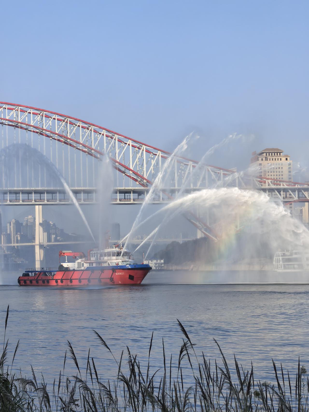 重庆建成大型水上音乐喷泉。消防救援船和一艘大型游轮,以及几艘小型快艇就位。随着大型救援车架起几门水炮,喷射出百米水柱。在阳光的照耀下。一道靓丽的彩虹印入眼帘。原来正在举行水上救援演练。让游人叹为观止