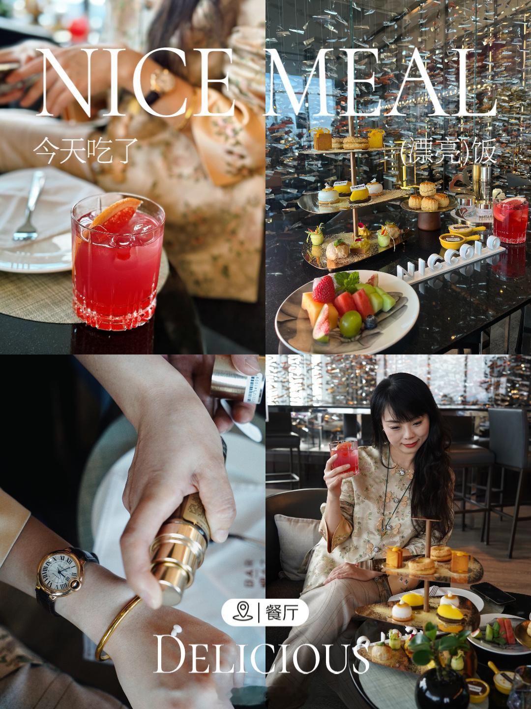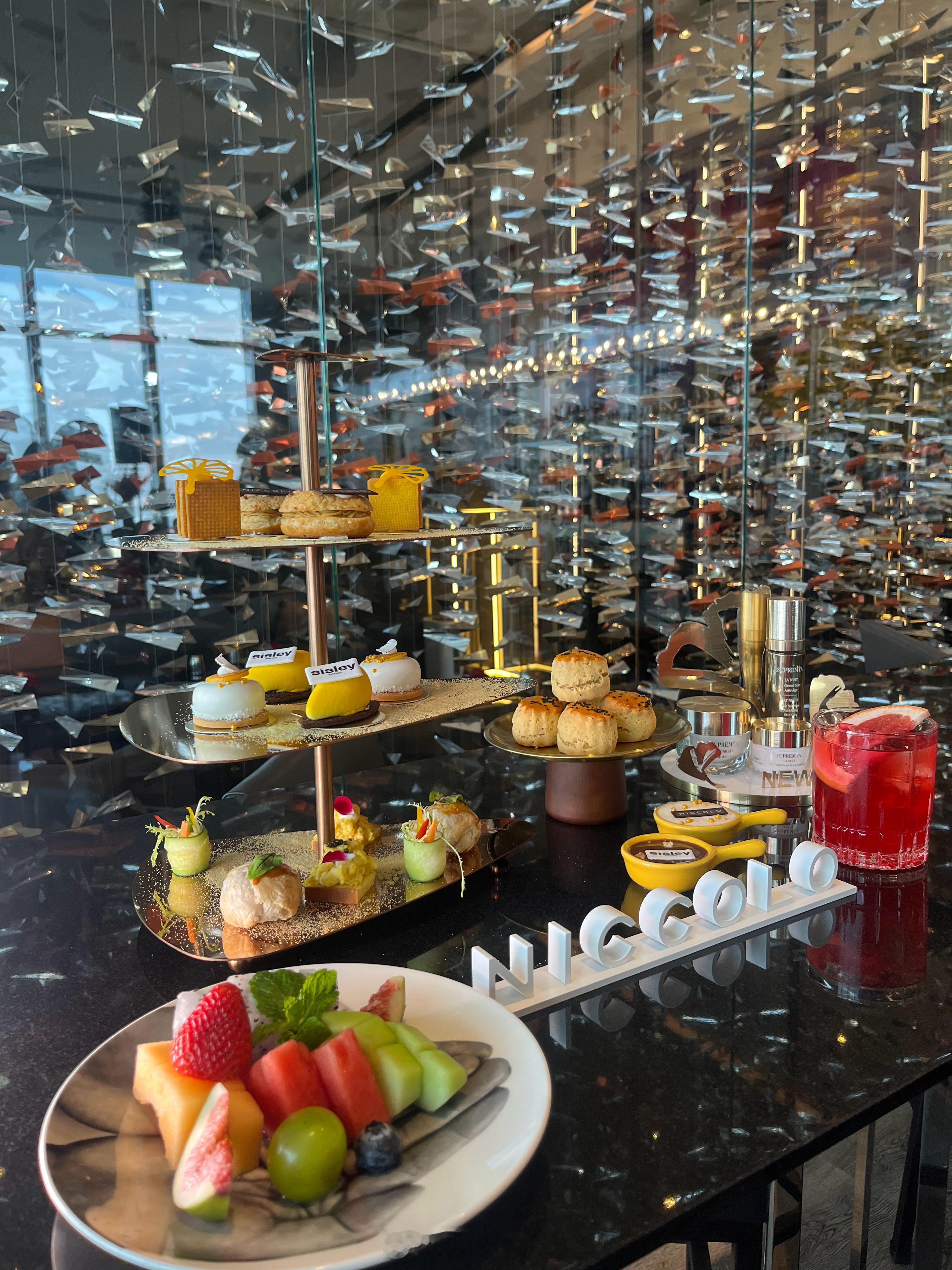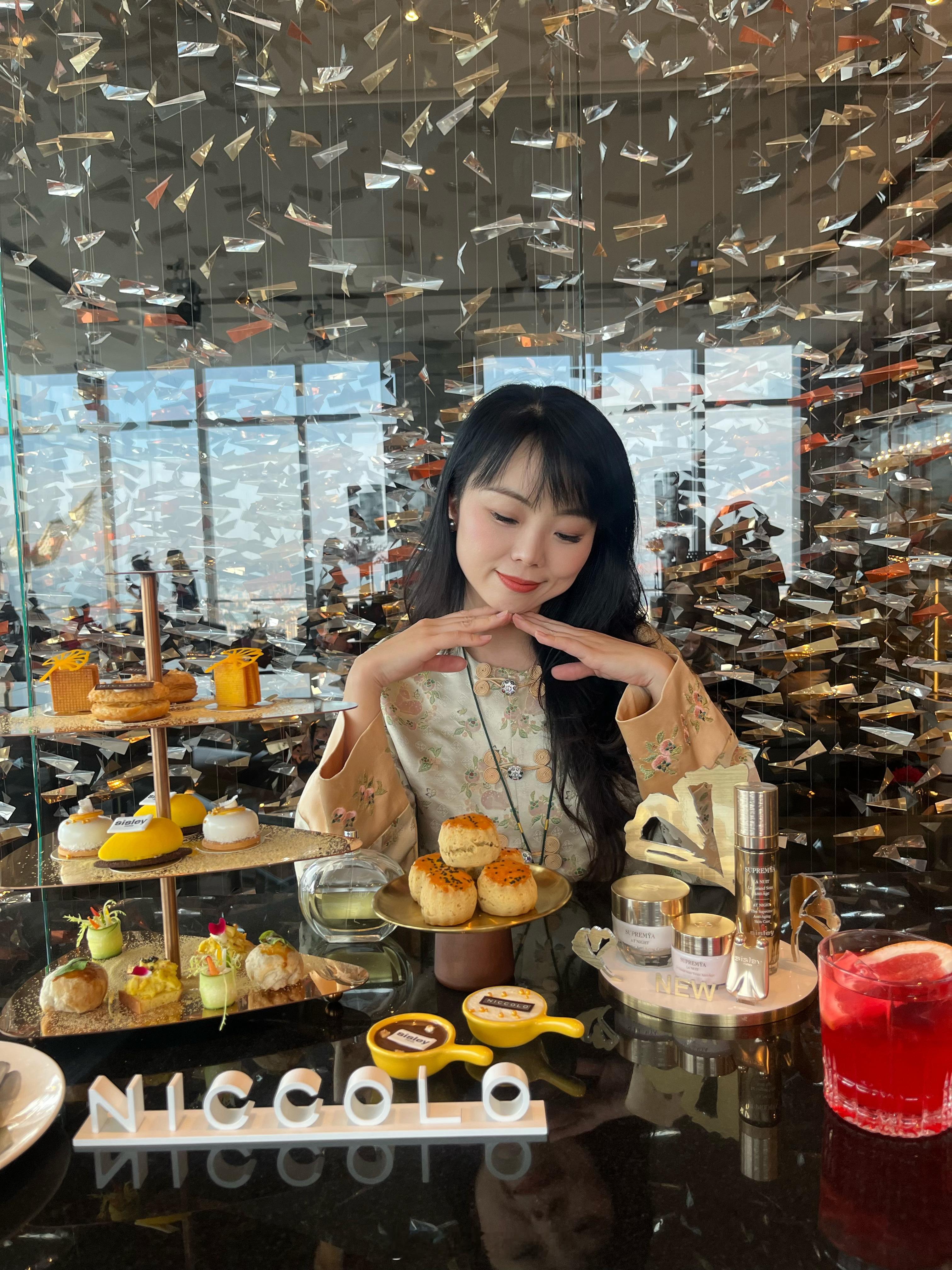 今日是金光闪闪的贵妇Look 。主要是为了契合Sisly 的贵妇定位与本餐主题《鎏金焕臻》联名下午茶Title 。以Sisley银杏叶灵感来源的柠檬挞、品牌Logo香草柚子芝士蛋糕、馥郁果香的芒果椰子慕斯,清爽自然,适应贵妇们不喜甜定调。但本人最爱Mini惠灵顿牛排和蟹肉鱼子酱咸点,此时配一杯普罗赛克起泡酒,成就一个集齐了冬日,暖阳,微醺要素的快乐下午茶时光。限12.10前,推荐给贵妇姐姐们。消费TIPS:1.人民币458*元含两杯自选咖啡或茶饮;人民币568*元含两杯特调饮品或两杯尼依格罗定制普罗赛克起泡酒。2.活动期间于悦廊购买「鎏金焕臻」主题联名下午茶即可获得希思黎伴手礼一份。(数量有限,先到先得。)3.酒店62楼悦廊每日中午12点至晚上6点供应。