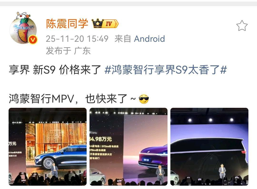 陈震:享界新S9价格来了 鸿蒙智行享界S9太香了最低价格为30.98万元! 这个价格在同级别应该来说比较有竞争能力的,S9小改款车型无论是价格还是产品力方面没有任何的毛病。 看来鸿蒙智行首款MPV上市越来越近了,到时候又会增加一款新的畅销车型。 各位是怎么看的?欢迎评论区留言。