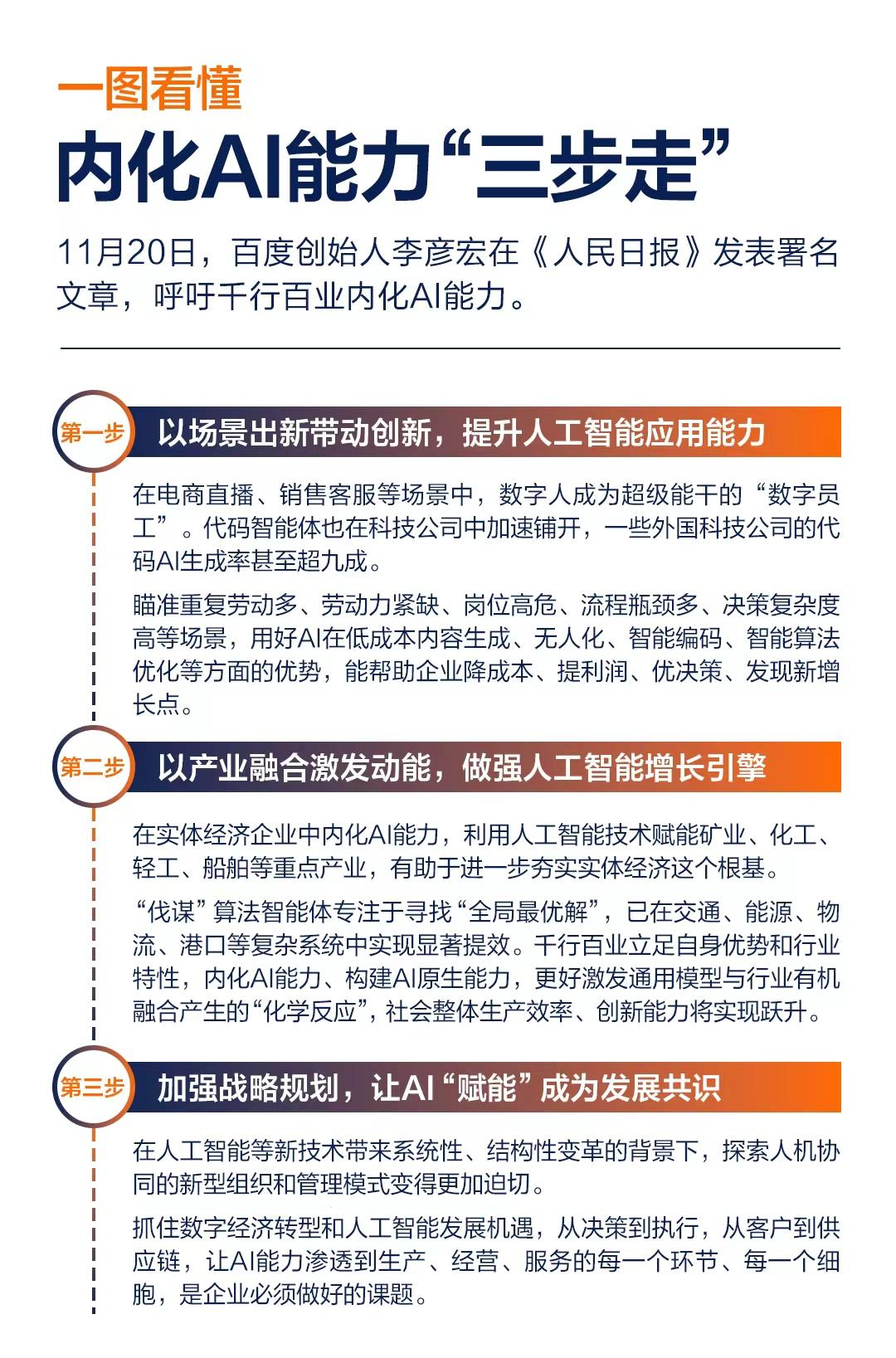 【李彦宏人民日报发文,AI内化不止是用技术,更是重构企业组织能力】 11月20日,百度创始人李彦宏在《人民日报》发表署名文章,文章中提出了“三步走”方法论:以场景出新带动创新,提升人工智能应⽤能力;以产业融合激发动能,做强人工智能增长引擎;加强战略规划,让“AI赋能”成为发展共识。这正是当下传统企业尤其是国央企内化AI能力的核心破局框架。在“十五五”以新质生产力驱动高质量发展的背景下,人工智能已从企业发展的“可选项”变为决定竞争格局的“底层要素”,“内化AI 能力”不再是“要不要布局”的战略讨论,而是企业的生存必需。 然而现实中,不少企业却偏离了这一方向,陷入典型困境:一方面因担忧在智能转型中掉队而倍感焦虑,另一方面又误将“AI辅助写报告、编代码”这类个体层面的工具应用,等同于“组织级AI能力内化”。这种混淆“工具使用”与“能力内化”的认知偏差,让企业只能在表面用AI,未能搭建起支撑长期发展的核心智能能力,也让三步法的价值未能充分发挥。 先看清一个关键:局部应用再高效,也成不了内化能力,真正的AI内化“不在个人层面,而在组织层面”,那三步法该如何落地? 场景出新是AI内化的基础起点,核心在于依托真实业务痛点验证价值。像慧播星这样的数字人技术已在电商直播、销售客服等场景落地,成为高效运转的“数字员工”;代码智能体在科技企业加速推广,部分外国科技公司的代码AI生成率甚至超九成。这些实践的共性在于,均从企业“重复劳动多、流程瓶颈突出”的实际需求切入,通过解决具体问题实现AI价值验证,为后续深化应用积累经验,奠定内化基础。 产业融合是AI内化的关键进阶,需推动AI深度嵌入产业链核心环节。我国作为全球唯一拥有全部工业门类的国家,为AI与实体经济融合提供了广阔空间,百度算法智能体“伐谋”的应用极具代表性:在鄂尔多斯伊金霍洛旗,伐谋与AI信控系统协同,实现跨河通勤高峰时段车均延误再降低5%;在中信百信银行,伐谋使风险特征挖掘效率提升100%,同时让风控模型的风险区分度提升2.41%;百度Apollo无人驾驶技术则贯通产业链上下游,构建起从硬件、整车到场景的完整协同生态。这些案例清晰表明,只有将AI与产业链关键环节深度绑定,才能实现从“工具应用”到“能力渗透”的跨越。 需特别明确的是,“利用AI提升局部生产力”并不等于“真正的AI内化”。李彦宏强调,真正的AI内化“不在个人层面而在组织层面”,核心是让AI能力成为企业的“神经系统”——而非孤立的“工具或器官”。 在新质生产力加速培育的背景下,企业竞争的焦点已从“是否使用AI”转向“是否真正内化AI”。唯有让AI深度融入组织生产、经营、决策的全流程,成为企业的“原生能力”,才能在高质量发展浪潮中站稳脚跟,将智能红利切实转化为可持续的竞争优势。