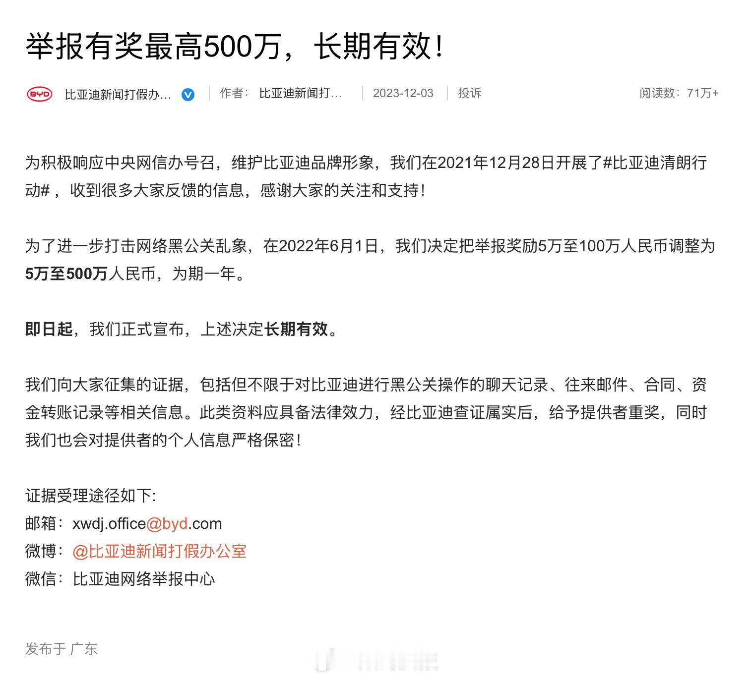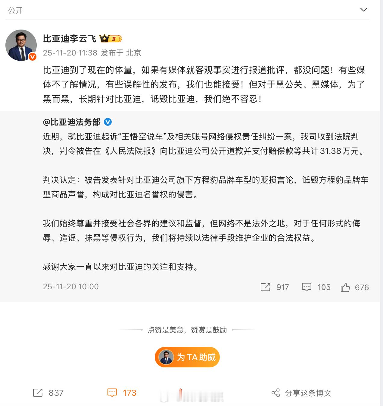 “王悟空说车”侵权比亚迪案判决,支付赔偿款等共计 31.38 万元近日,比亚迪起诉自媒体账号 “王悟空说车” 及相关主体的网络侵权责任纠纷一案尘埃落定。11 月 20 日,比亚迪法务部发布公告披露,法院经审理认定,被告发表针对比亚迪旗下方程豹品牌车型的贬损言论,已构成对企业名誉权的侵害,最终判决被告需向比亚迪公开赔礼道歉,并支付共计 31.38 万元赔偿款。随后,比亚迪集团品牌及公关处总经理李云飞转发该公告并表示:“比亚迪到了现在的体量,部分媒体因不了解情况发布误解性内容,我们能够理解并接受,但对于黑公关、黑媒体,为了黑而黑,长期针对、诋毁比亚迪的行为,我们绝不容忍!”此前在公开活动中,李云飞也曾明确立场:“如果有些媒体或自媒体恶意的揣着明白装糊涂,为了黑而黑,通过一些不实的和误导性的报道和信息,长期针对比亚迪,诋毁比亚迪,比如说一个礼拜有七天,至少五个工作日都在黑比亚迪,这个是不能接受也不能容忍的。”此前,中央网信办在《汽车行业网络乱象专项整治行动公开曝光一批典型案例》中就明确指出,抖音账号“王悟空说车”“987疯狂奶爸”因多次歪曲事实诋毁新能源汽车性能、恶意抹黑汽车企业形象声誉,被依法依约关闭。 “王悟空说车”侵权案并非个例,而是比亚迪长期遭受网络侵权的一个缩影。据行业不完全统计,作为新能源汽车领域的头部企业,比亚迪近年来成为汽车行业网络“黑公关”“黑媒体”的主要攻击目标之一。新华社11月17日发表的评论更直指行业痛点,批判“拉踩同行”“阴阳友商”等乱象,明确指出车圈非理性竞争不仅误导消费者决策,更会分流企业研发投入,阻碍产业高质量发展。目前,包括比亚迪在内的许多车企,都已采取行动反击黑公关。在2021年,比亚迪就宣布悬赏5-100万打击黑公关。为加强这一行动的效果,在2022年,比亚迪将举报奖励提升至5万至500万元人民币。在近两年的时间里,比亚迪已对多个“黑号”发起诉讼,同时对多个重点“黑号”进行密切关注。2024年年底,比亚迪起诉自媒体博主“龙猪-集车”的名誉纠纷权案胜诉,被告长期存在侮辱、诋毁比亚迪且严重歪曲事实的行为,构成名誉侵权,法院判令被告删除侵权言论、公开赔礼道歉,并赔偿比亚迪经济损失等共计201.87万元。当前,中国新能源汽车行业正加速迈向高质量发展新阶段,清朗健康的市场与舆论环境,是产业行稳致远的重要基石。作为行业头部企业,比亚迪坚守正确价值观,技术竞争才是良性之争,对黑公关频频“重拳出击”,这份坚持不仅是对自身合法权益的坚定捍卫,更是以企业担当净化行业生态,为中国新能源汽车产业筑牢向上根基、参与全球竞争注入正向力量。