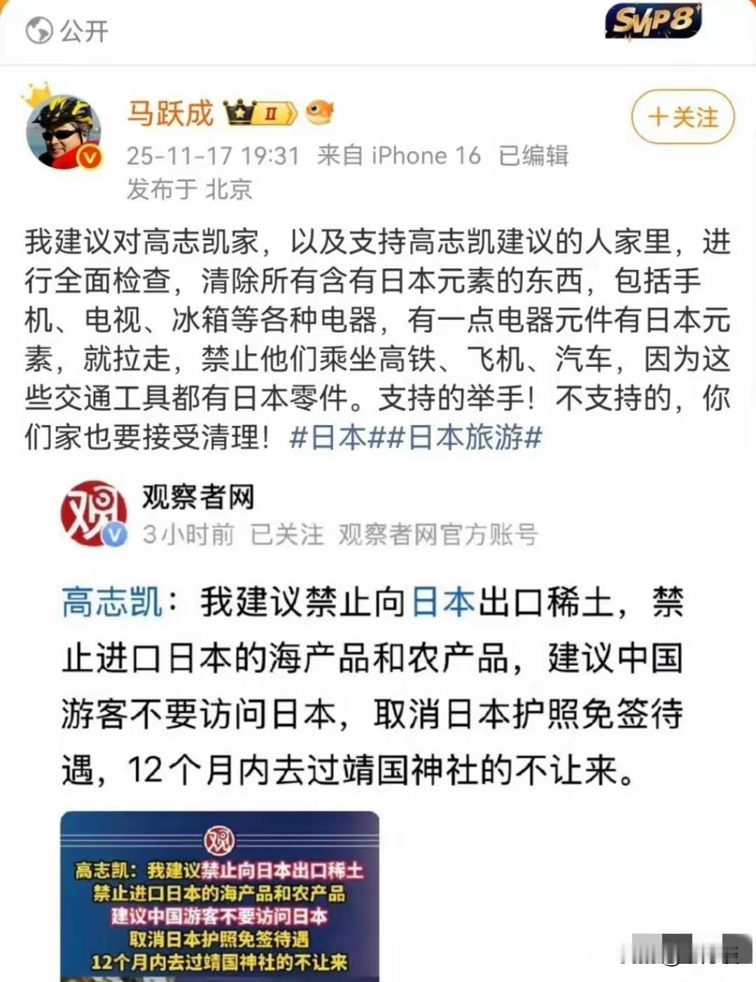 高志凯只是建议停止向日本出口稀土,就有网友跳出来认为应该严格审查高志凯家里是否使用了日本元素的物品,只要涉及日本零部件的物品全部拉走,而且禁止高志凯先生乘坐飞机、高铁等,因为这些产品当中必然含有日本的零部件等。我不知道这位网友为什么这么急的就跳出来,因为在目前。中日关系如此僵化当下,对日本实行经济制裁是必要的,也是维护国家利益的合法手段,不知道这位网友为什么会这么急呢?难道我们还应该跟日本亲密无间合作吗?任由日本对我们的诋毁和对我们主权内政的干涉吗!