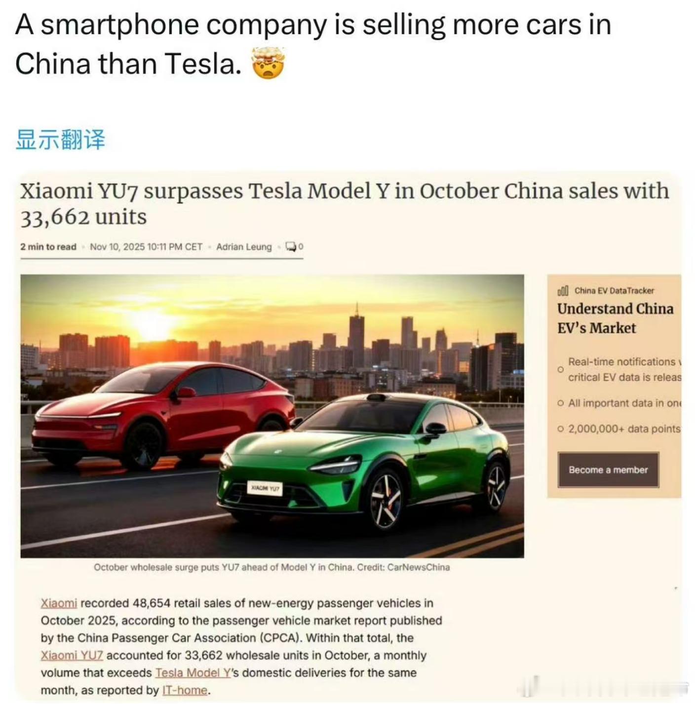 老外这话真的是杀人诛心啊:一家智能手机公司在中国销售的汽车数量超过了特斯拉