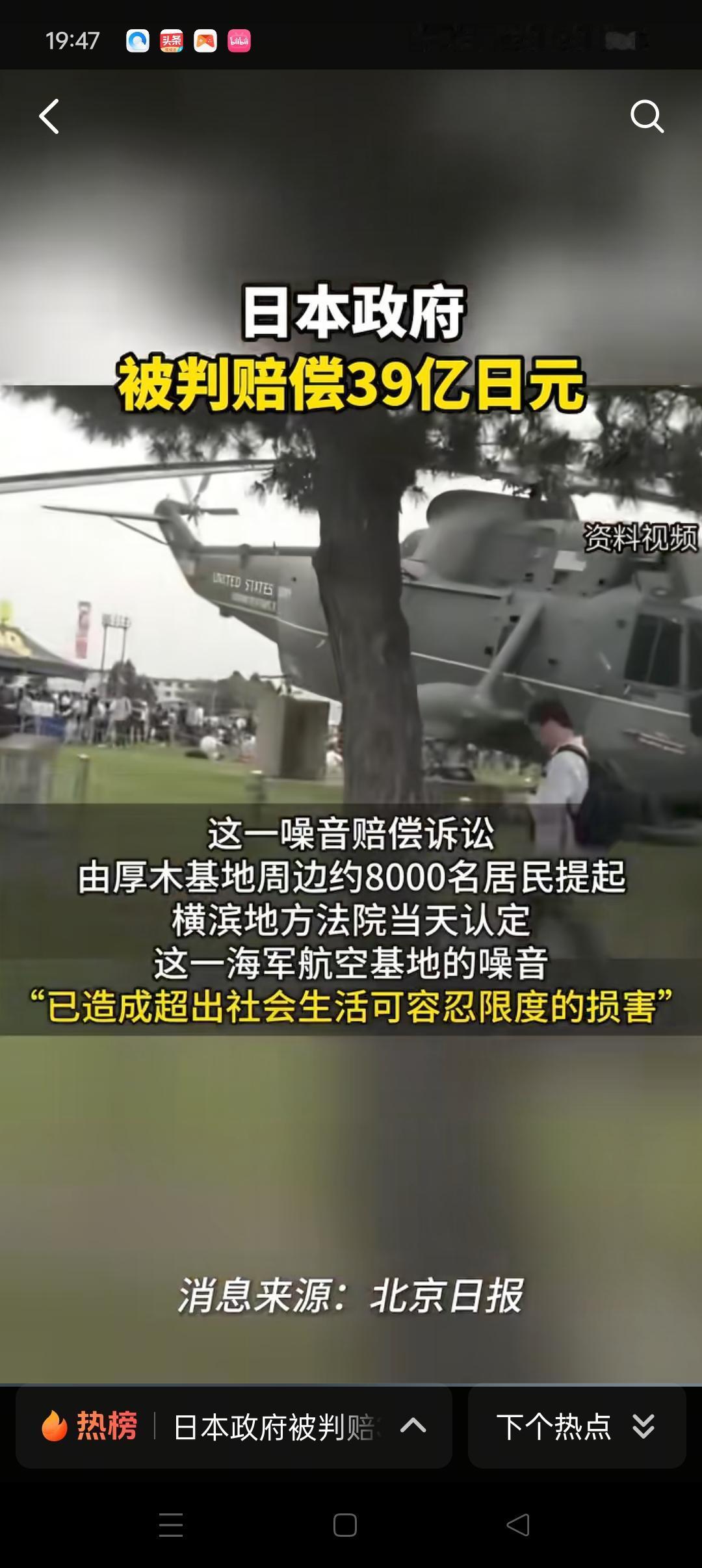 日本政府要赔偿高额日元,数目竟然达到了39亿日元,如果折合成人民币的话的也是亿级的。起因就是驻日美军基地的一些声音吵到了附近的居民,而居民忍不了,最后地方法院要求日本政府来赔偿给那些被驻日美军基地吵到的人。看到这里日本政府赔偿看来是老天爷要惩罚啊,毕竟人在做天在看嘛!