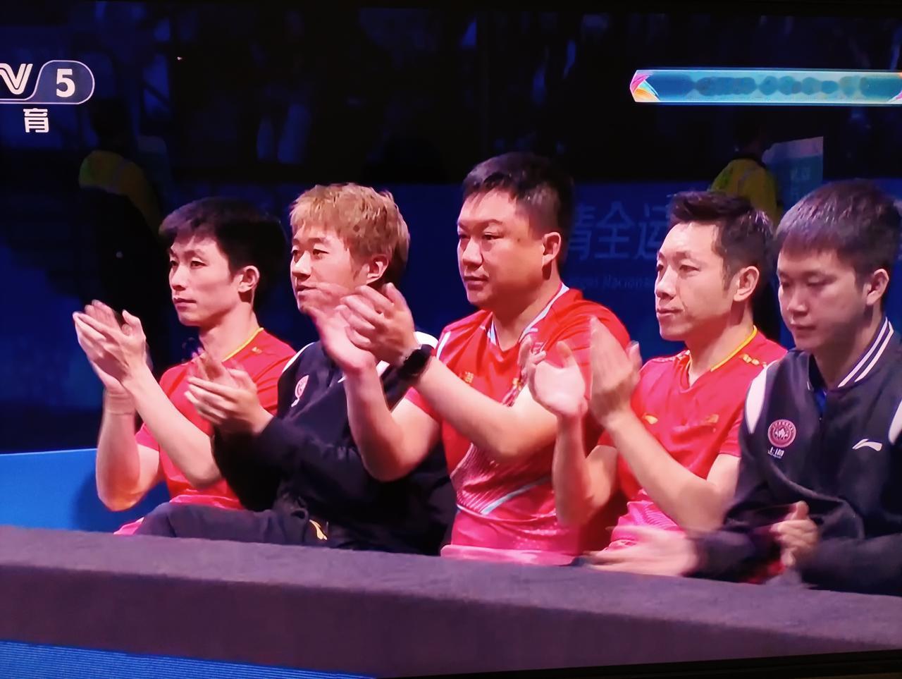 势均力敌[奋斗]! 第二盘第一局王楚钦5-5樊振东! 这是2025年第十五届全运会乒乓球男团决赛! 目前大比分北京八喜队1-0领先上海地产集团队,因为第一盘黄友政/马龙3-1战胜了许昕/周恺。 第二盘两支队伍的一单选手都是世界顶尖选手,比分一直交替上升,从4-4到5-5,又到6-6! 这一会儿王楚钦8-7领先了[奋斗]! 评论区继续播报战况!