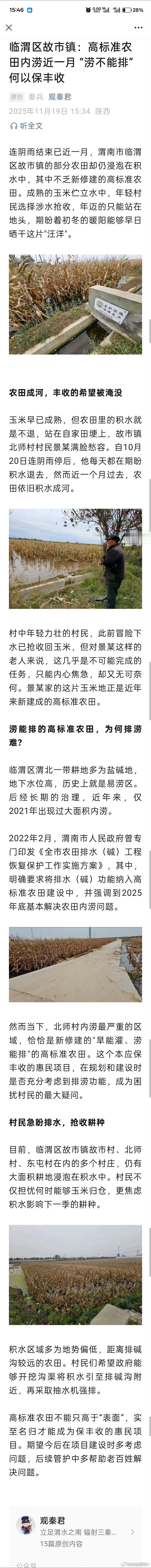 陕西渭南高标准农田排水不畅,丰收之基受考验 有网友爆料:渭南临渭区故市镇的高标准农田在连阴雨结束后近一月,仍深陷积水之中,成熟玉米泡水、村民涉水抢收,让“旱能灌、涝能排”的承诺显得苍白无力。作为盐碱地易涝区,渭南市政府曾规划排水工程,但投入重金的惠民工程在雨水考验下暴露了短板。高标准农田建设需“旱涝兼防”,排水设计需满足短时间内排净积水的标准。然而,故市镇的工程存在明显短板,低洼区域与排碱沟衔接不畅,强排设施缺位,导致积水难排。相比之下,农发行渭南分行支持的80万亩农田排水项目,通过“沟沟相通、渠沟相连”的灌排体系,让盐碱地变身肥沃田,生动诠释了规划精准与建设扎实的重要性。惠民工程的生命力在于实效。排涝能力的强弱,直接关系到农民的“钱袋子”和国家的粮食安全。唯有精准补齐排水短板,让每一分投入都转化为抗灾能力,才能让盐碱地真正摆脱“涝季水汪洋”的困境,让高标准农田成为农民的“定心田”,让丰收的希望不再被积水淹没。