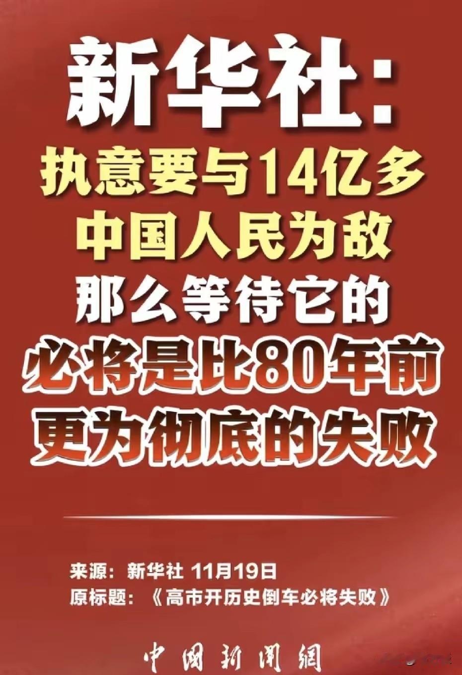 新华社慷慨激昂对日本首相搞事早苗的严厉警告:执意要与14亿多中国人民为敌,那么等待他的必将是比80年前更为彻底的失败。如果搞事早苗不听劝,仍然一意孤行挑衅,惹怒 14亿多中国人民,那么日本将迎来迎头痛击,甚至有可能把日本带入万劫不复之地。这一切都是搞事早苗自找的,中国人不是那么容易好欺负的,中国人民早已经站起来了,对于任何的挑衅侵略行为,必将予以坚决的反击!搞事早苗不自量力,螳臂挡车,必将彻底被击垮。
