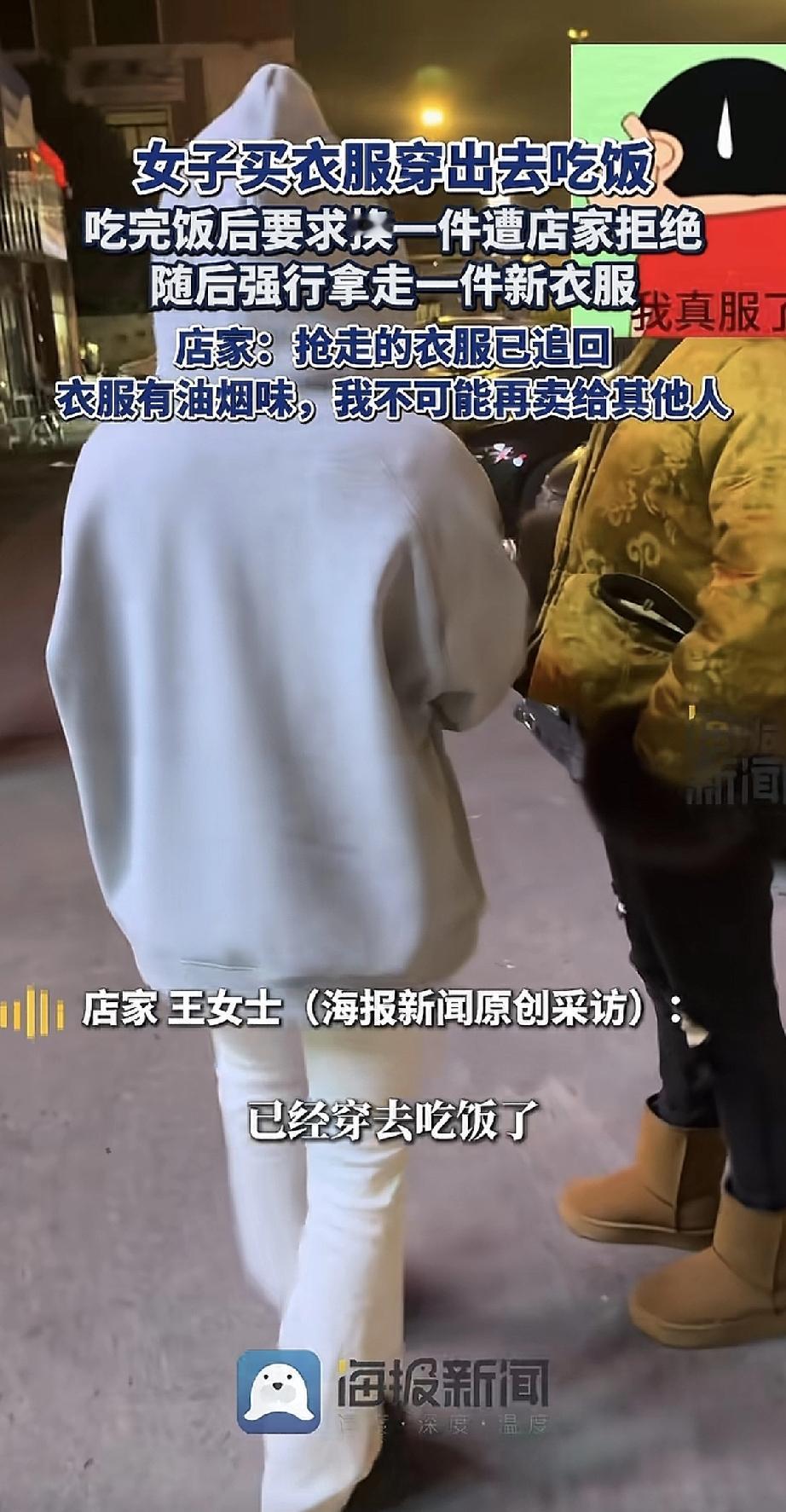 这操作也太离谱了!一位女子买了新衣服,直接穿去吃饭,吃完回来竟然要求换一件。被店家拒绝后,她强行拿走了一件新衣服。 店主王女士很无奈:衣服沾了油烟味,根本没法再卖给其他顾客,被抢走的衣服已被追回。 网友都看不下去了:穿过的衣服还想退换,这不是明摆着占便宜吗?这大概率是网购做多了这种事情。