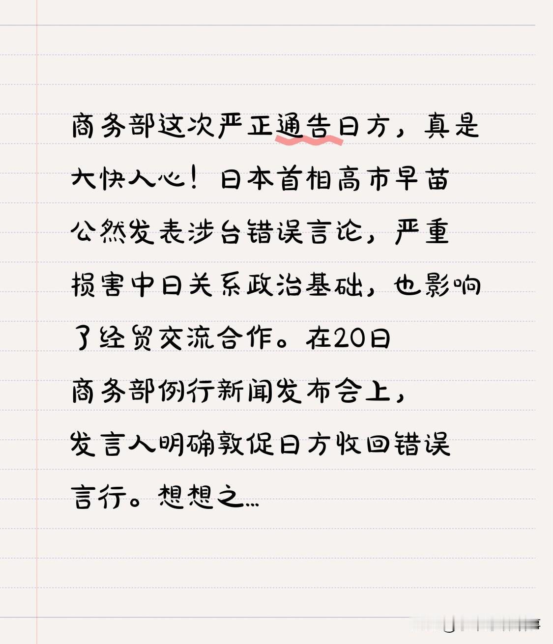 商务部此次严正通告日方,着实大快人心!日本首相高市早苗公然发表涉台错误言论,严重破坏中日关系政治基础,影响经贸交流合作。20日商务部例行新闻发布会上,发言人明确敦促日方收回错误言行。 此前日本经济产业省缺乏事实依据,将多家中国企业列入出口管制清单,实在无理。移出两家企业算是做了点实事。 中方态度明确,日方不能既伤害感情又索取利益。若其一意孤行,中方必将采取必要措施,让其为错误行为付出代价。