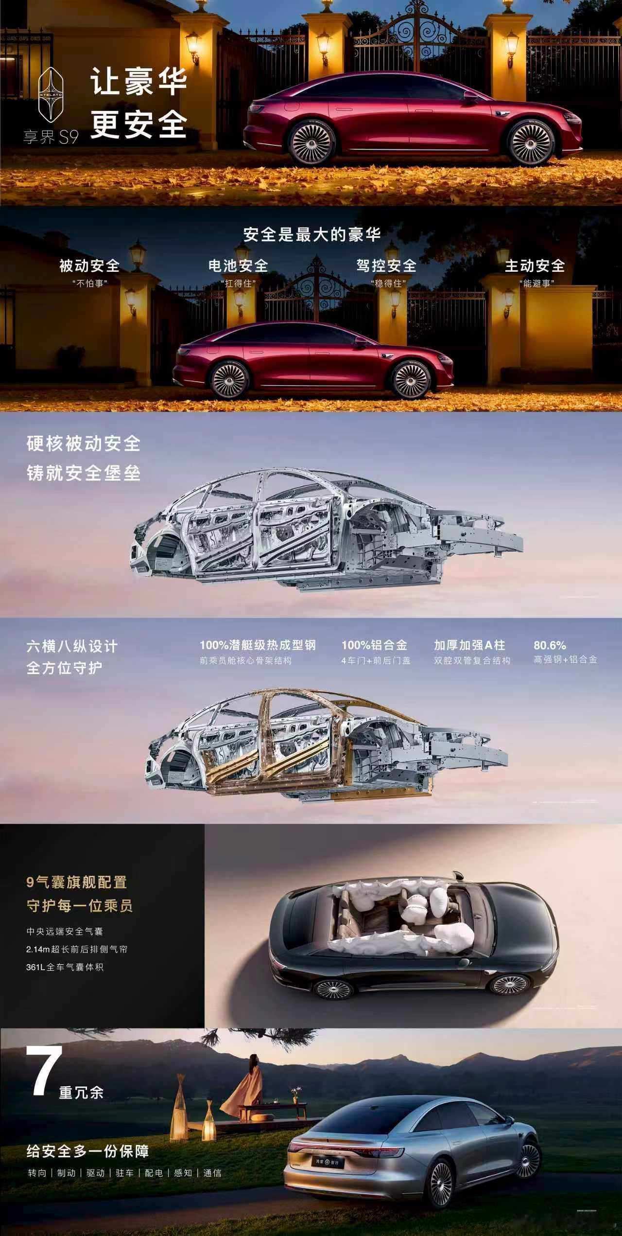 享界S9是把“安全”写进豪华基因!36颗高精度传感器+华为乾崑ADS 4,主动安全4.0提前替你踩下“隐形刹车”;81.4%高强钢笼式车身+9气囊,被动安全像隐形保镖;15层防护电池+7重安全冗余,电池安全拒绝“热失控”;全车隐私声盾+鸿蒙通信加密,通信安全防偷窥防监听。安全,才是30万级最硬核的豪华!