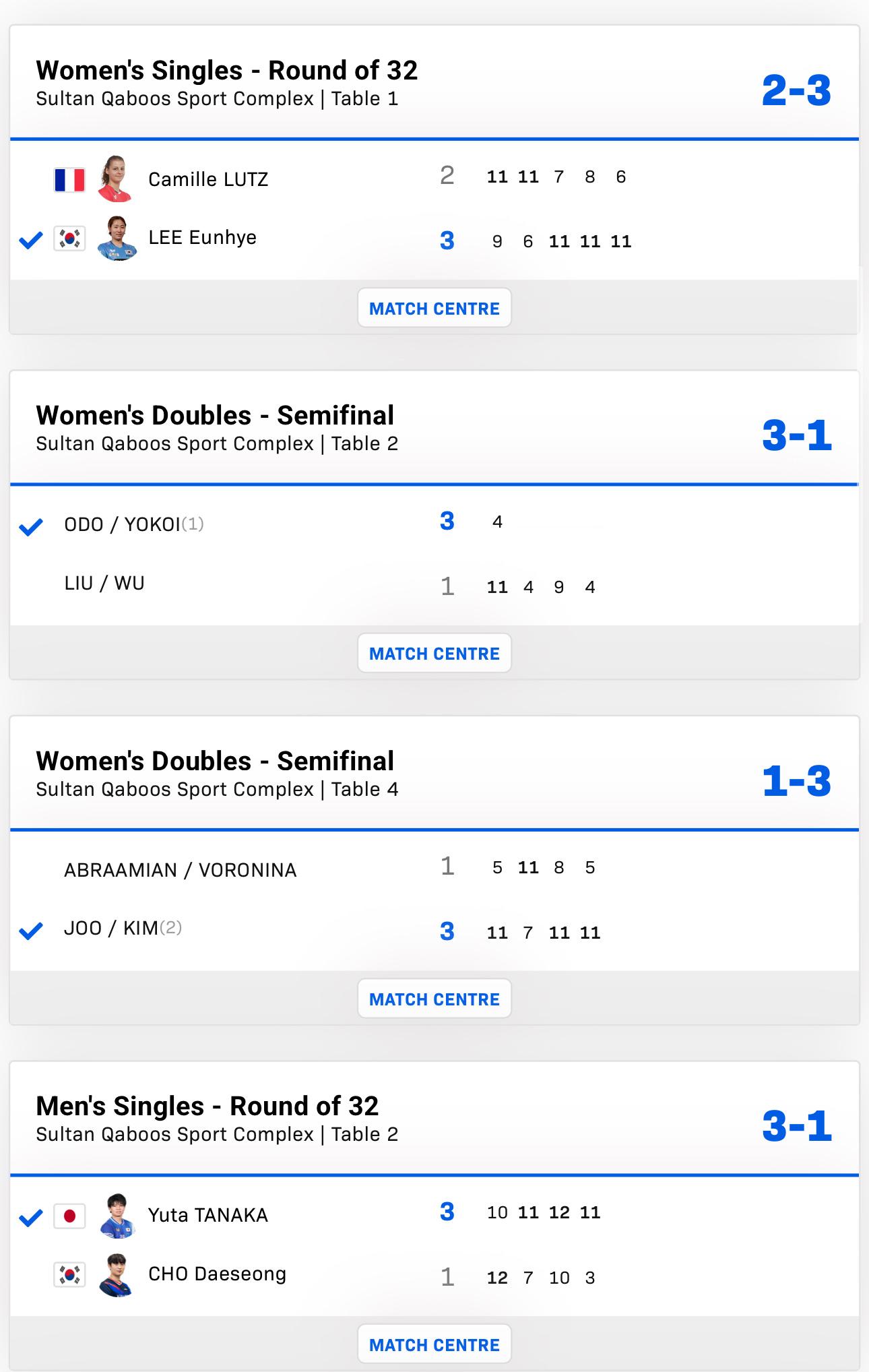 2025wtt马斯喀特球星赛男女子单打4-2田中佑汰3-1赵大成李恩惠3-2卡米尔女子双打4-2横井咲樱/大藤沙月3-1刘杨子/吴佳牧娃朱芊曦/金娜英3-1阿尔巴米安/维罗妮娜
