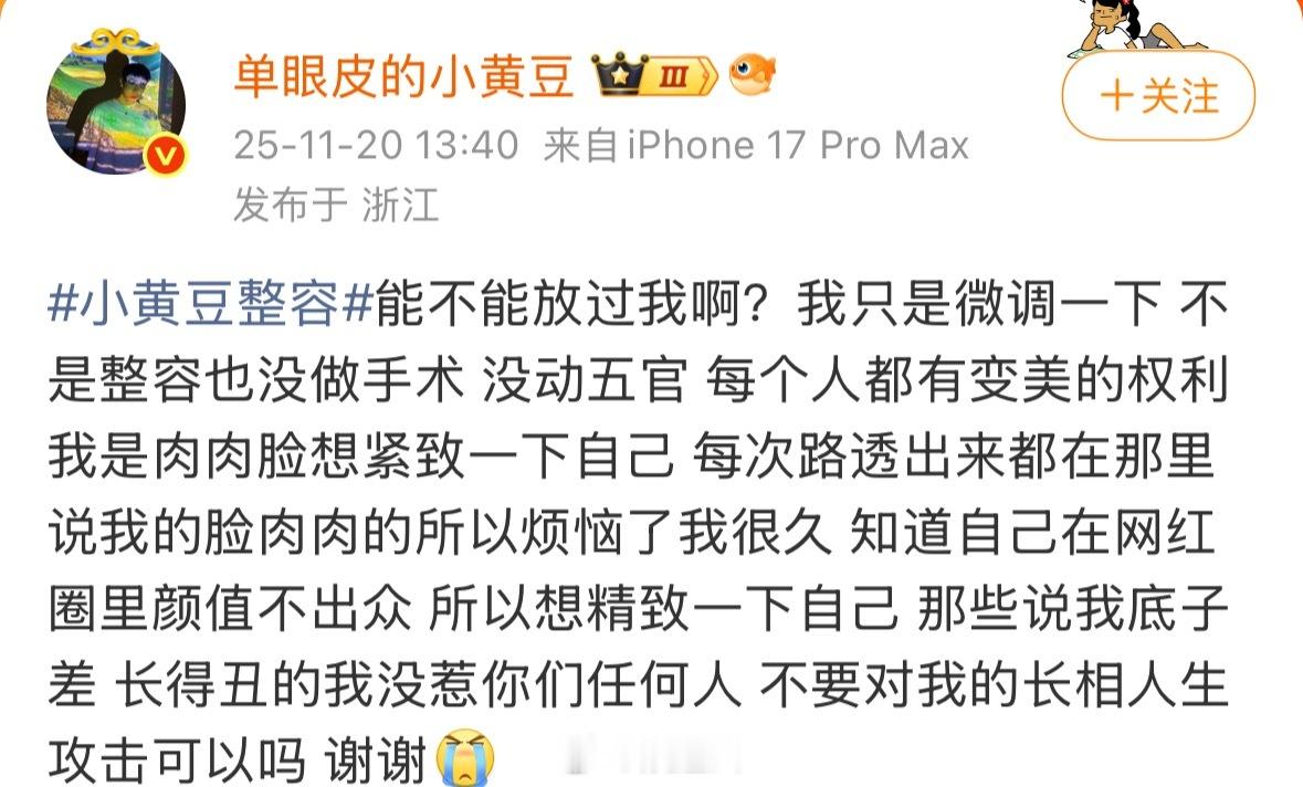 小黄豆辟谣整容“我只是微调一下不是整容也没做手术没动五官,那些说我底子差,长得丑的我没惹你们任何人 不要对我的长相人生攻击可以吗?谢谢”