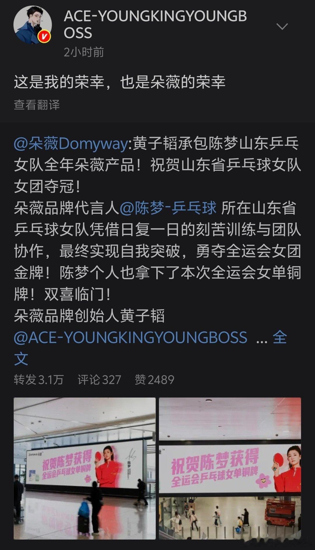 谁能想到黄子韬和陈梦的梦幻联动啊!!两个青岛人,黄子韬支持陈梦和山东省乒乓球队,给他们承包了一年卫生巾!!黄子韬的影响力+山东全运会女团金牌,强强联动的含金量还在上升!!!能够dream一个两人的同框吗~