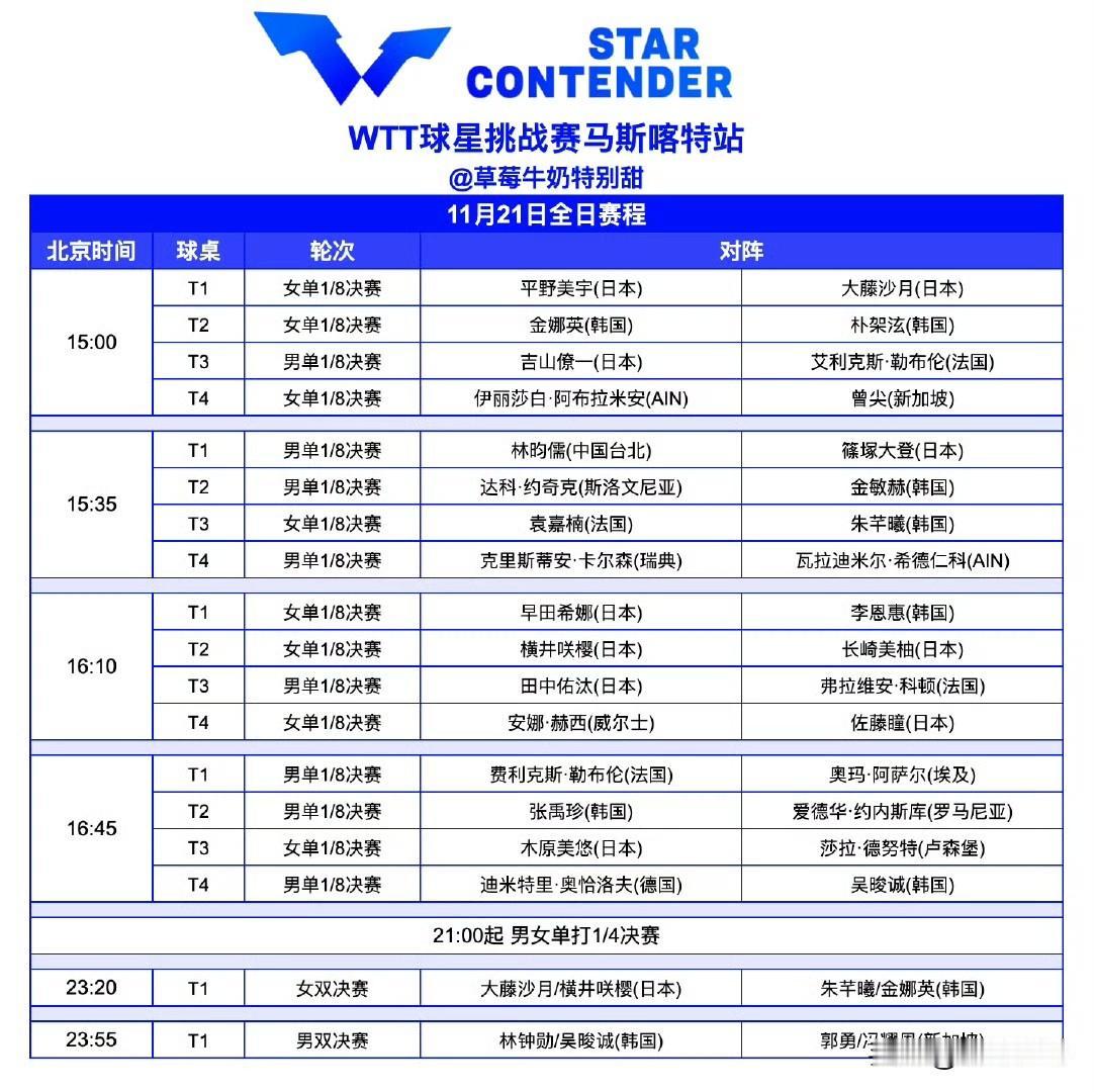 11月21日全日赛程P2 注: 今日还将进行男女单打1/4决赛