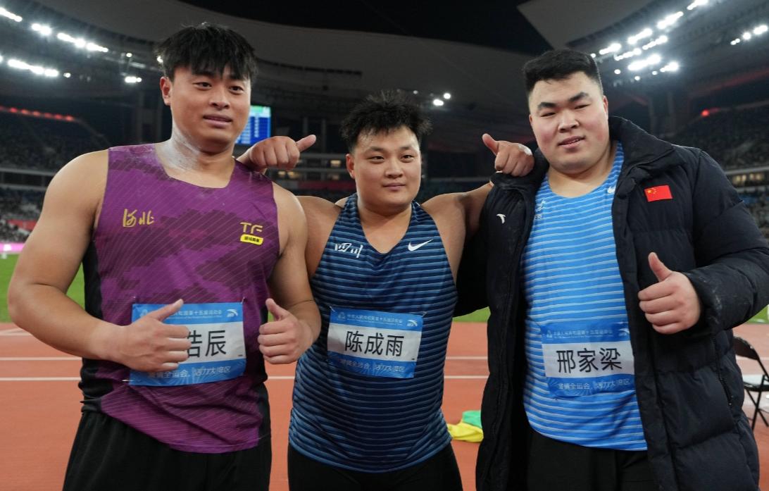 第十五届全运会男子铅球决赛,前三名都创造了个人最好成绩,四川队的陈成雨以20米37夺冠,与全国纪录仅相差7厘米,河北队的张浩辰和江苏队的陈鸿飞分别以20米30和20米12获得亚军和季军,8月份刚刚以20米44创造新全国纪录的邢家梁仅收获第四名,没有和他在铁饼比赛收获季军的双胞胎哥哥邢家栋一起获得奖牌。