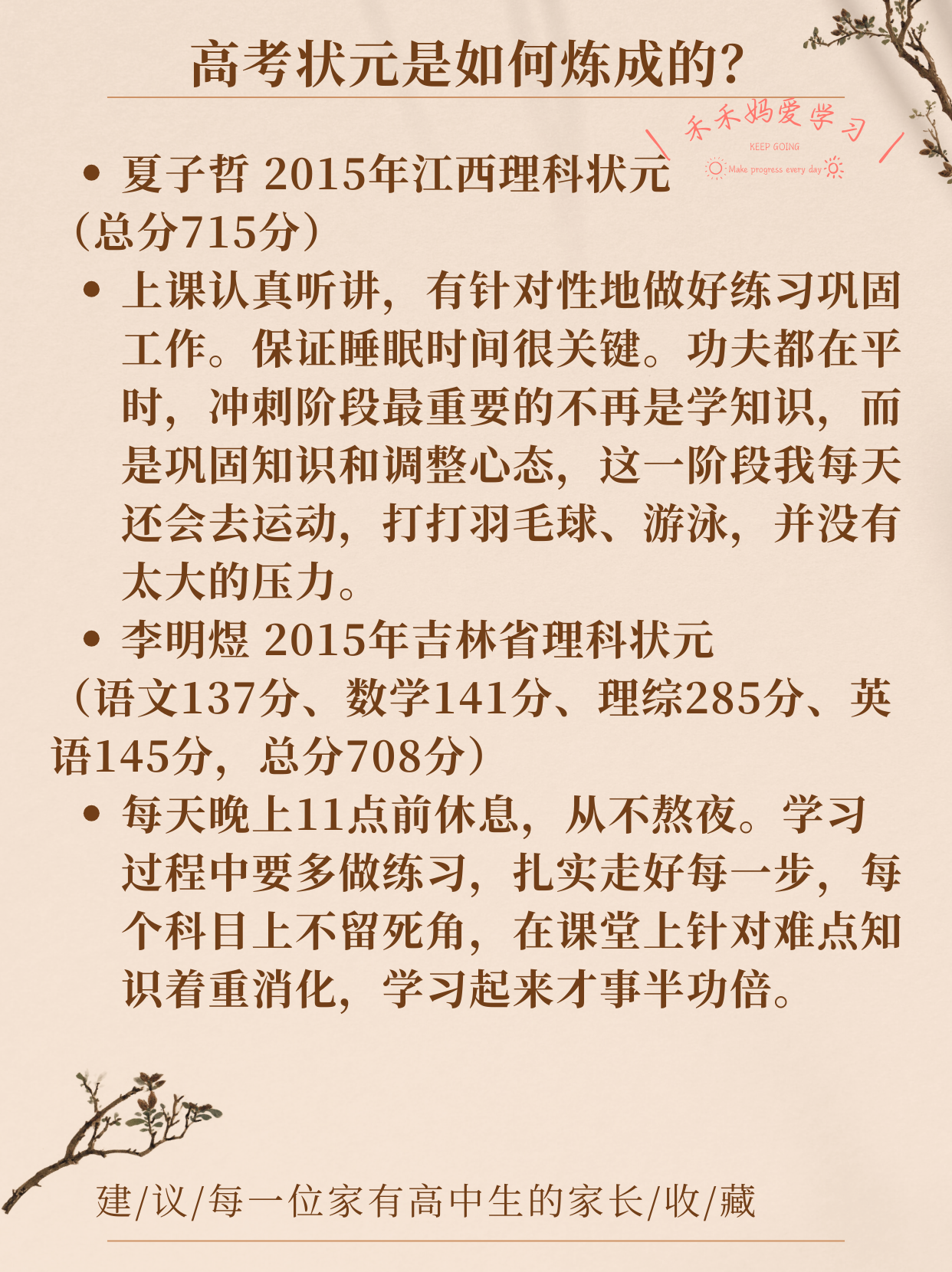 高中学习的侧重点是什么?如何学习才能在高考中脱颖而出?孔子曰:“学无常师,择善而从。” 意思是学习不应该固定师从一人,而应该广泛吸收各方优点,体现灵活的学习态度。 作为高考状元,在高中学习上相比普通学生,在学习经验上肯定有独特的优点,值得高中学子学习参考。 今天禾妈就给大家整理了2015年各省市文理科状元的学习经验总结,分享给大家,各位高中学子,尤其是正在上高三的学生们,可以收藏起来,仔细看看,择优吸收,说不定对你接下来的学习就非常有帮助呢。